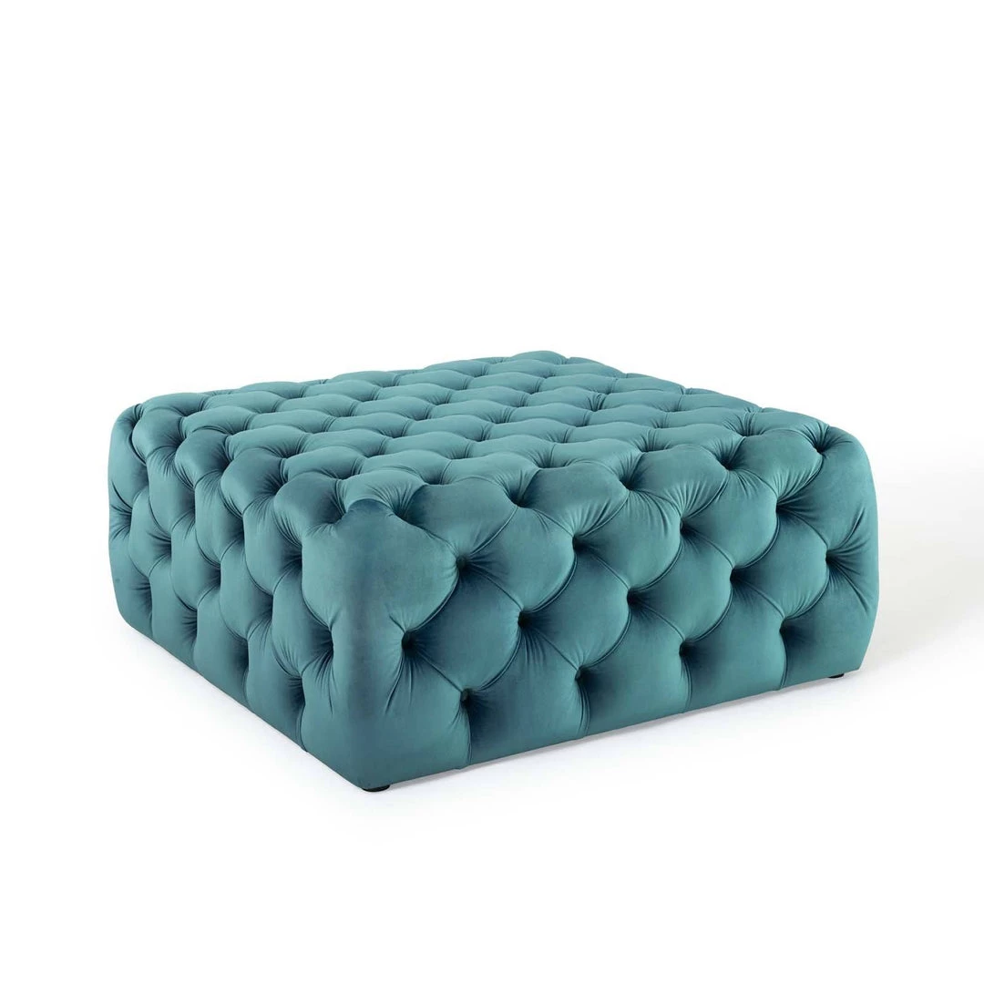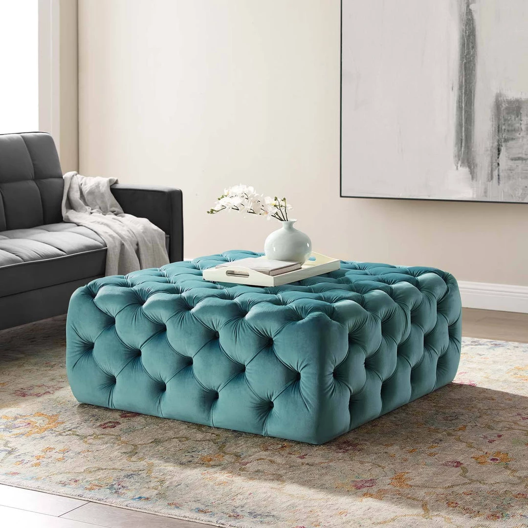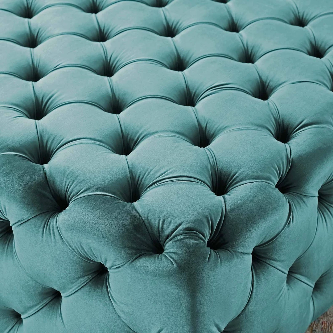 Amour Tufted Button Large Square Performance Velvet Ottoman Sea Blue