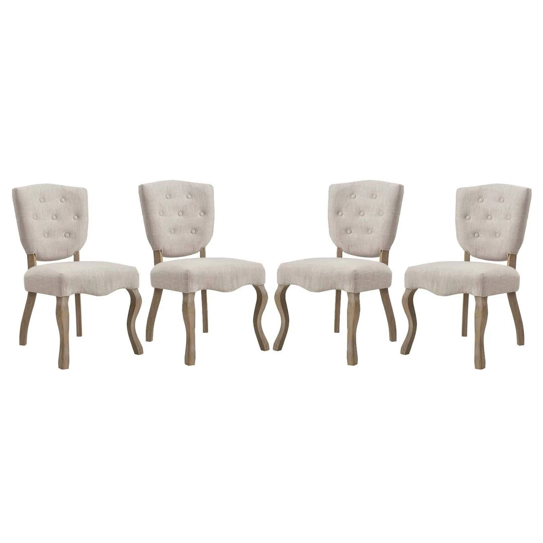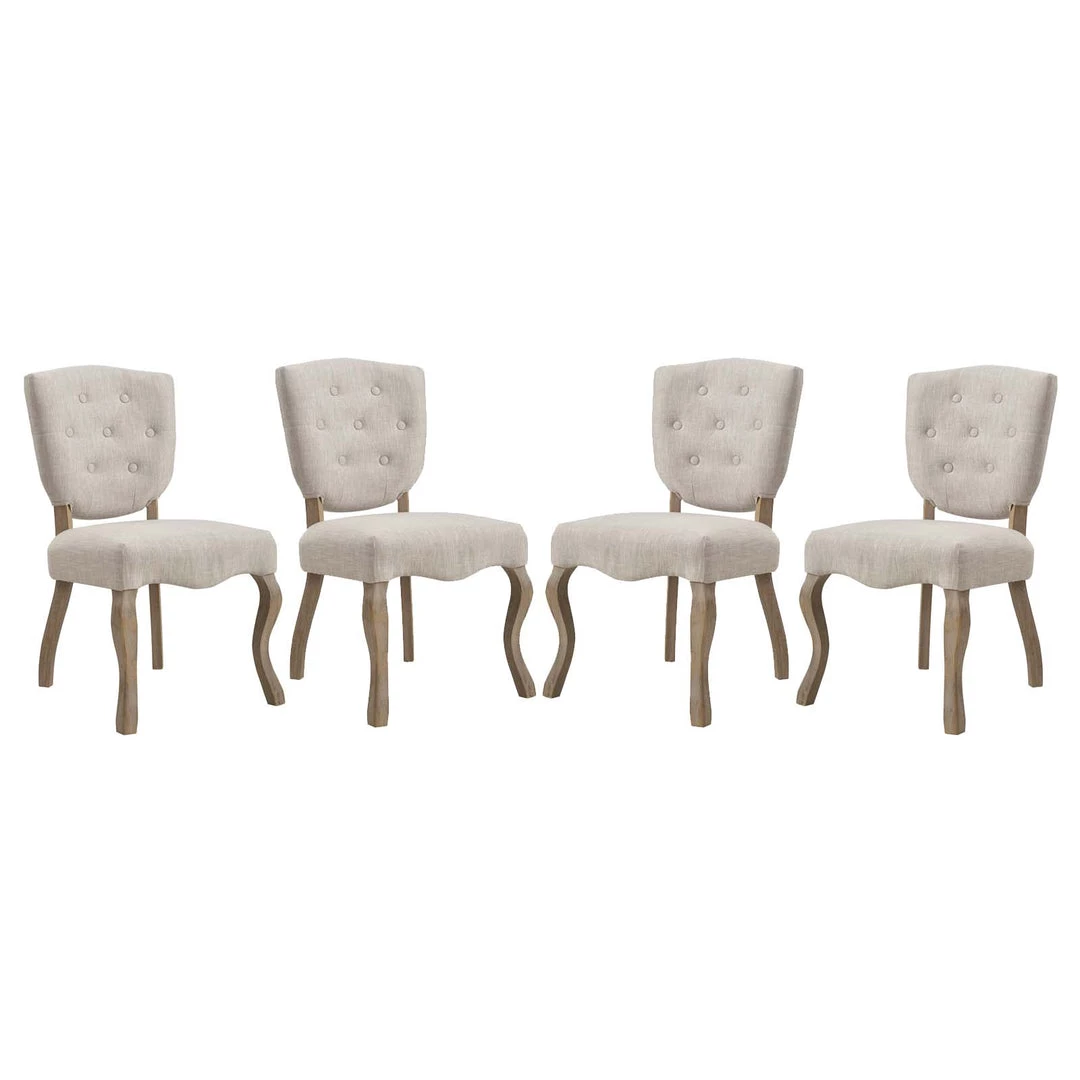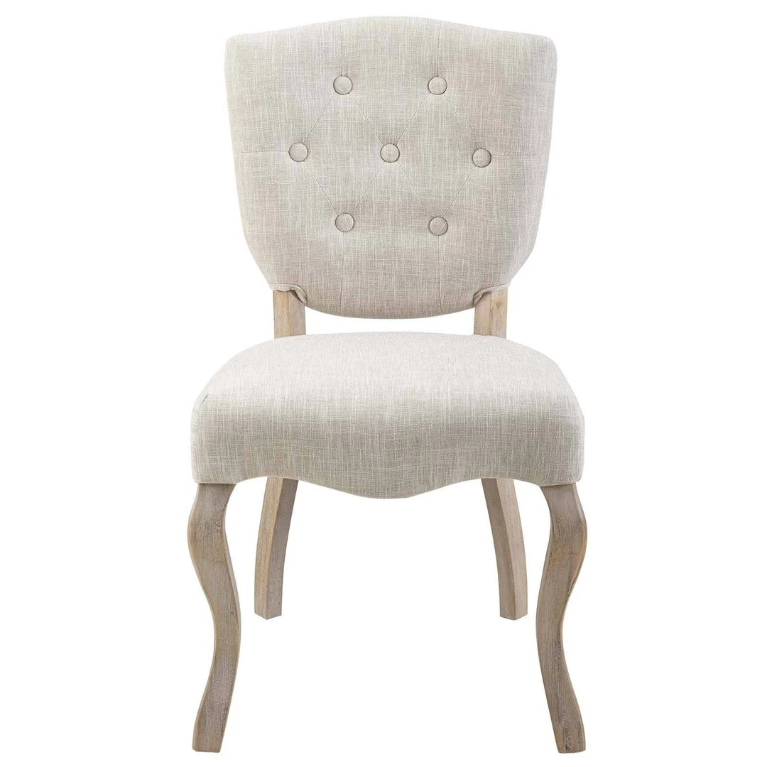 Usher forth a harmonious dining environment with the Array Vintage French Dining Side Chair. Four saber-shaped weathered wood legs develop a sculptured silhouette, while the shield back with button tufting displays hints of opulence. Complete with a generously padded seat, and soft polyester upholstery, Array comes with non-marking foot caps to preserve floor integrity, supports up to 331 pounds, and does not require assembly.