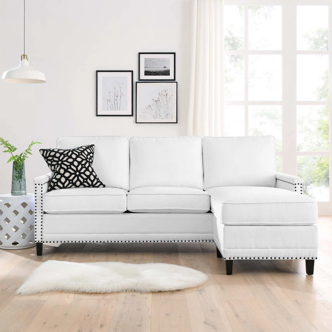Sit back and relax amidst streamlined style and supportive comfort with the Ashton Upholstered Fabric Sectional Sofa. Perfect for the living room or lounge area, this sofa is enriched with a tailored profile, separate seat cushions, and a classic nailhead trim. Upholstered in polyester fabric, this living room sofa is padded with dense foam and complete with a spring pocket support system to offer a premium seating experience. Durably crafted, this sectional sofa rests on solid wood legs with non-marking foot pins to protect flooring. Say goodbye to the days of hauling heavy furniture because Ashton ships in a conveniently portable box that’s easily maneuverable up staircases and narrow hallways. Assembly required. Sectional Sofa Weight Capacity: 1103 lbs.
