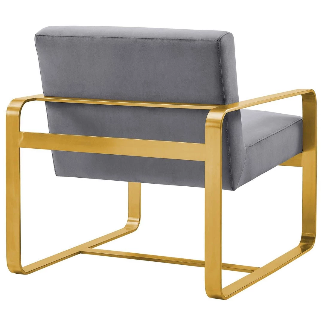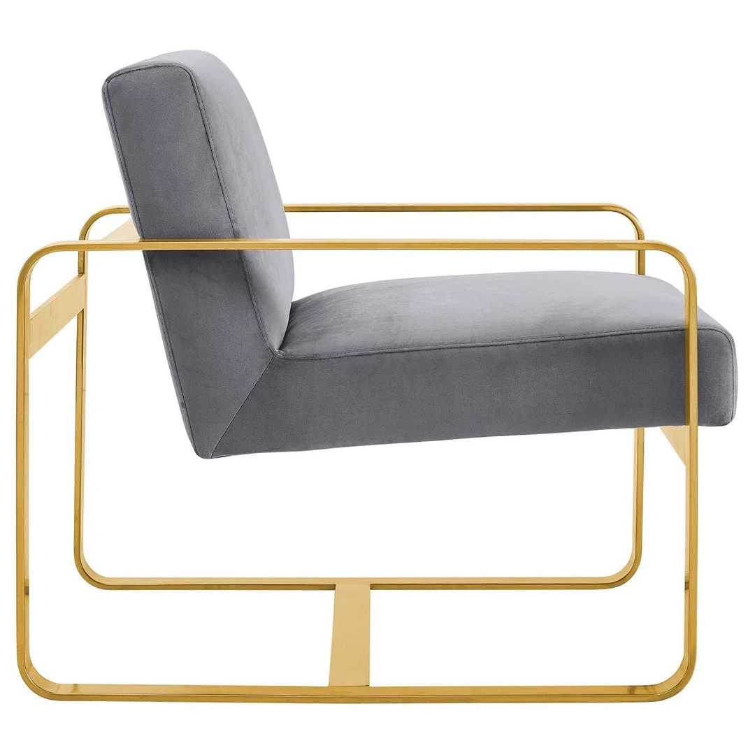 Embrace contemporary inspiration with Astute Performance Velvet Armchair. A modern update to your living room, bedroom, or office, Astute innovates with its artful frame and open design. Featuring a streamlined profile with sleek rounded corners, Astute comes with stain-resistant performance velvet upholstery and a gold stainless steel frame. Invite guests to a unique seating experience with this comfortable, chic lounge chair. Chair weight capacity 330 lbs.