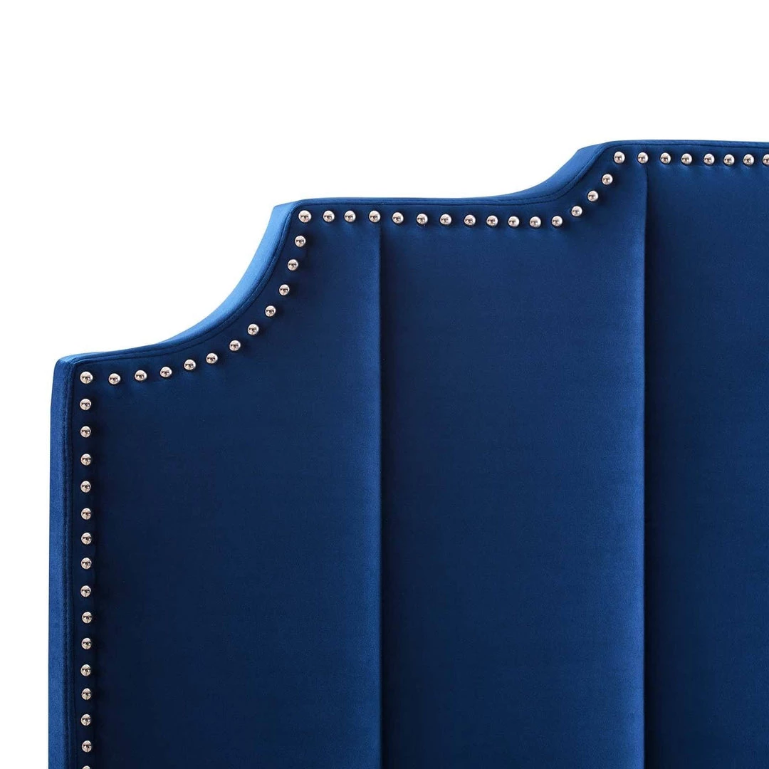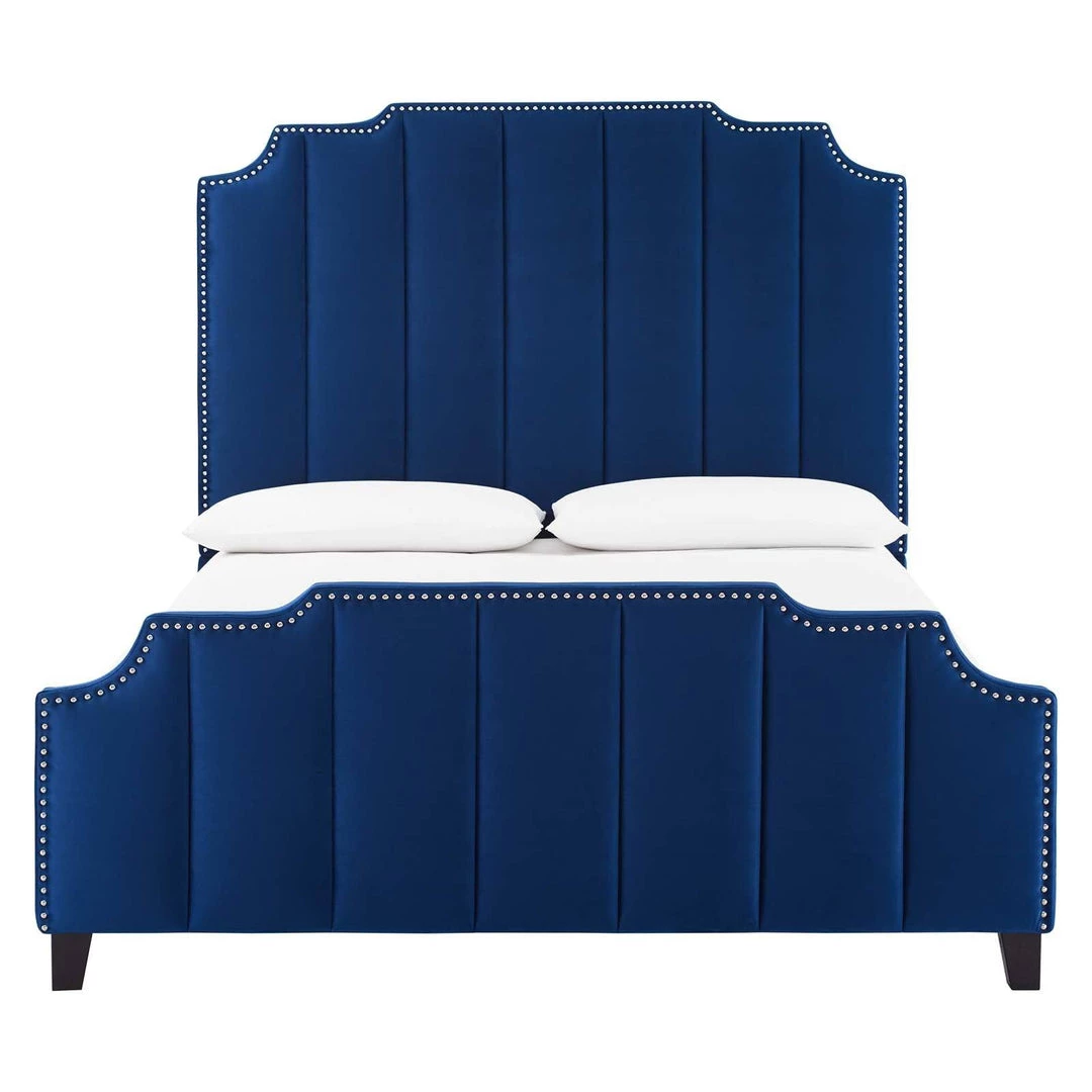 Make luxurious opulence the focal point of your master bedroom or guest suite with the Lucille Performance Velvet Queen Platform Bed. Abounding in glam deco style and vintage modern elegance, the upholstered headboard and footboard of this queen bed features channel tufting, nailhead trim, and a shapely silhouette. The padded queen headboard, footboard, and side rails come upholstered in soft, stain-resistant performance velvet upholstery that grants rich texture to the elegant form. Resting atop black wood legs with non-marking foot caps, this platform bed frame is a sturdy mattress foundation with a wood slat support system that eliminates the need for a box spring and promotes healthy air circulation for memory foam, latex, innerspring, and hybrid mattresses. Assembly Required. Bed Weight Capacity: 800 lbs.
