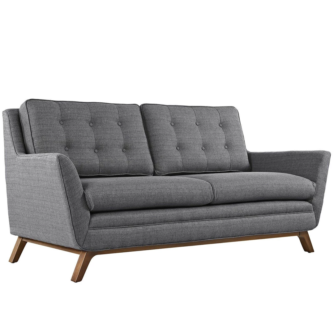 Dominate your décor with the expertly designed Beguile Collection. Exquisitely crafted with gently sloping arms, comfortable plush seat cushions, and adeptly tufted back cushion buttons, Beguile is a delightful collection that reinvents mid-century style. Outfitted with a solid wood walnut-stained base and fine fabric, Beguile comes perfect for living room, lounge and meeting areas.