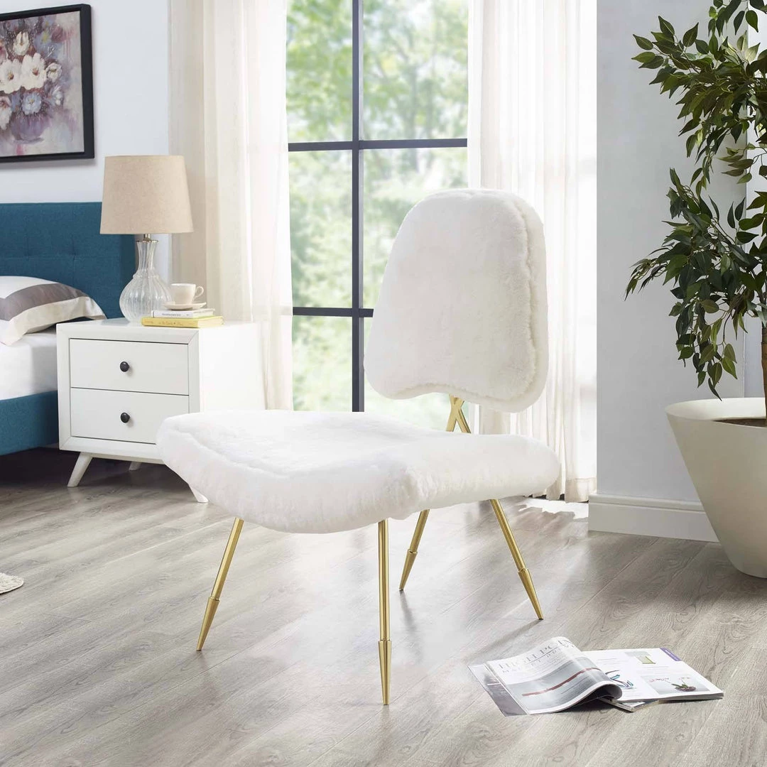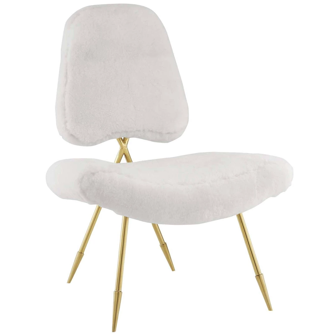 Survey your surroundings with confidence with the Ponder Lounge Chair. Ponder’s padded high-density foam seat gently slopes upward providing embracing comfort while the tapered back provides ergonomic support. Finely upholstered in luxuriously soft sheepskin fur, and supported by a sturdy gold stainless steel frame with four angled mid-century toothpick legs, Ponder makes a striking statement. Accentuate your modern decor with a contemporary living room or bedroom chair that elevates any empty area of your home.