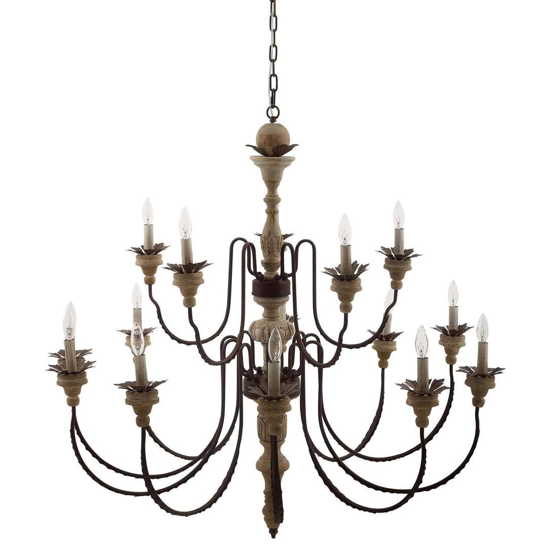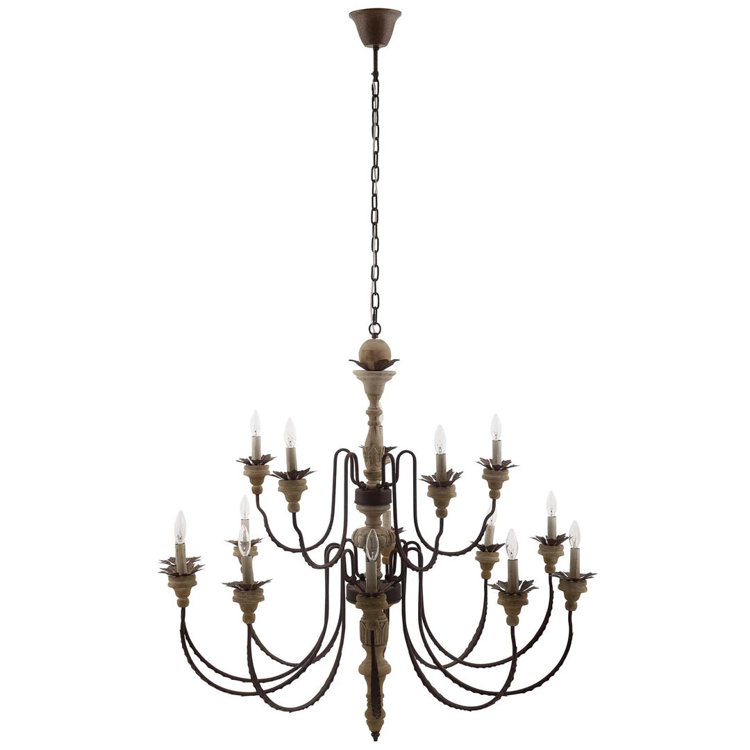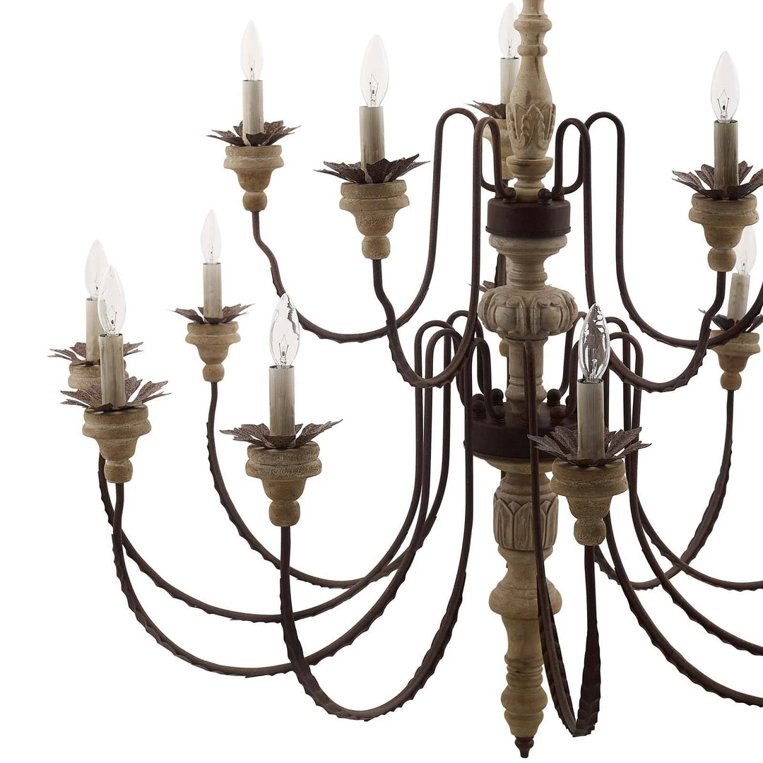 Elevate your home with the timeless elegance of the Nobility Candelabra Chandelier. A vibrant addition to your living room, bedroom, foyer, or dining room, this French vintage pendant chandelier features sweeping, leaf designed metal arms, a beautifully carved, tiered natural wood center column, and candle-style light holders each surrounded by an ornate leaf design. Nobility hangs from a 45.3″ metal chain with a flush wall mount and grants chateau charm to your home. This modern farmhouse pendant chandelier requires fifteen E12 25-watt light bulbs (not included).