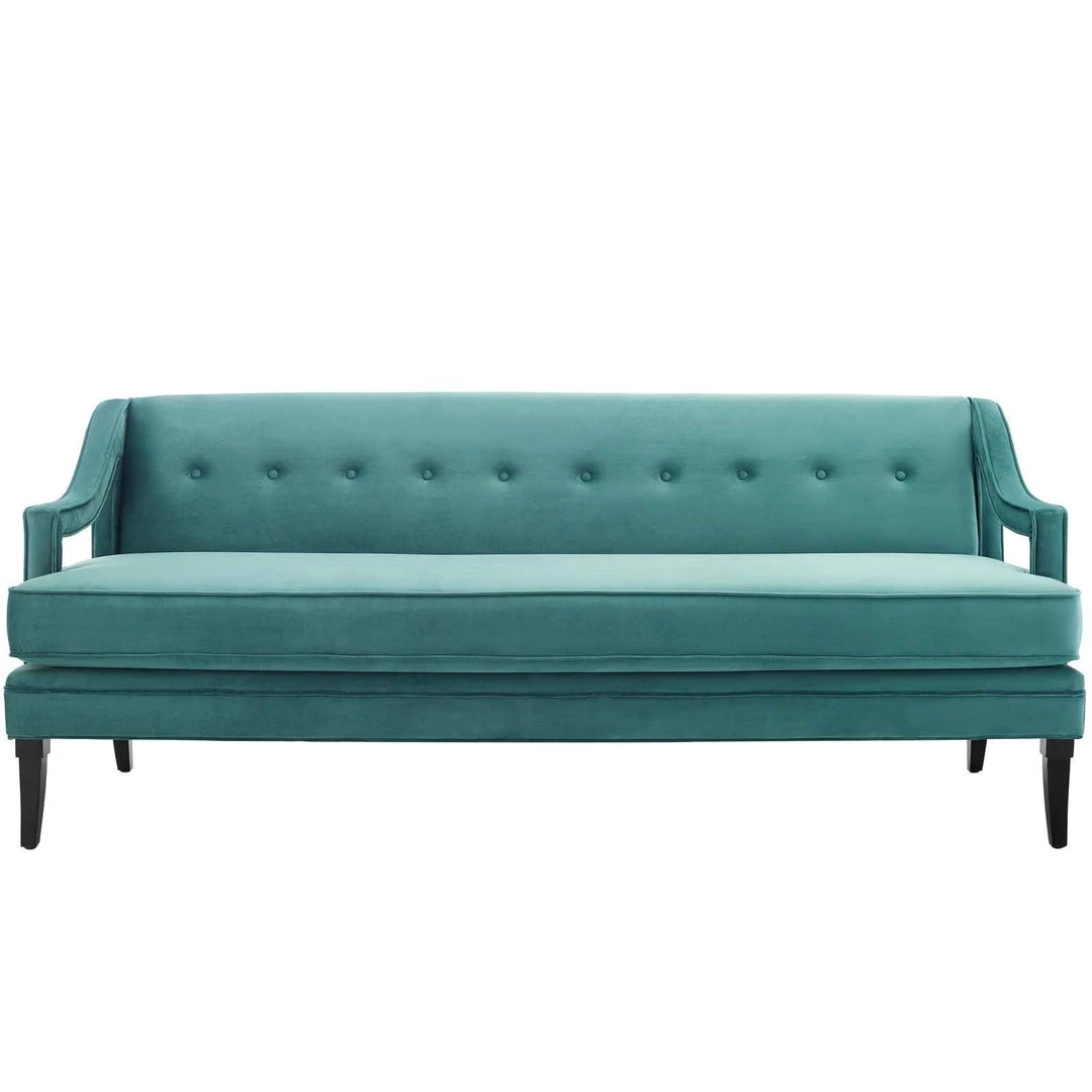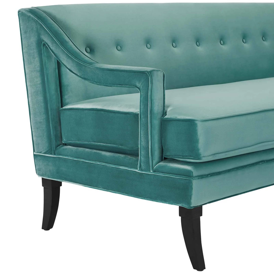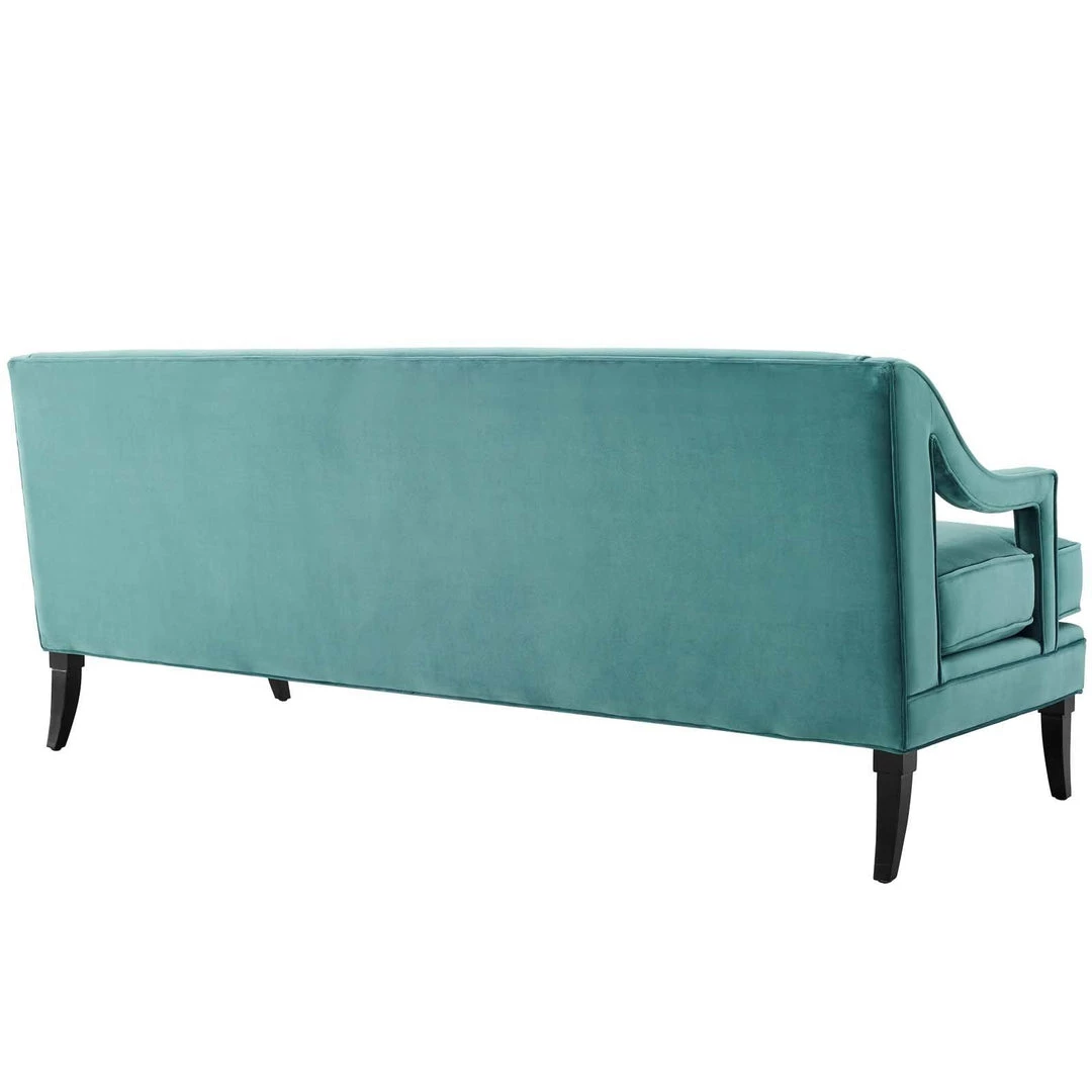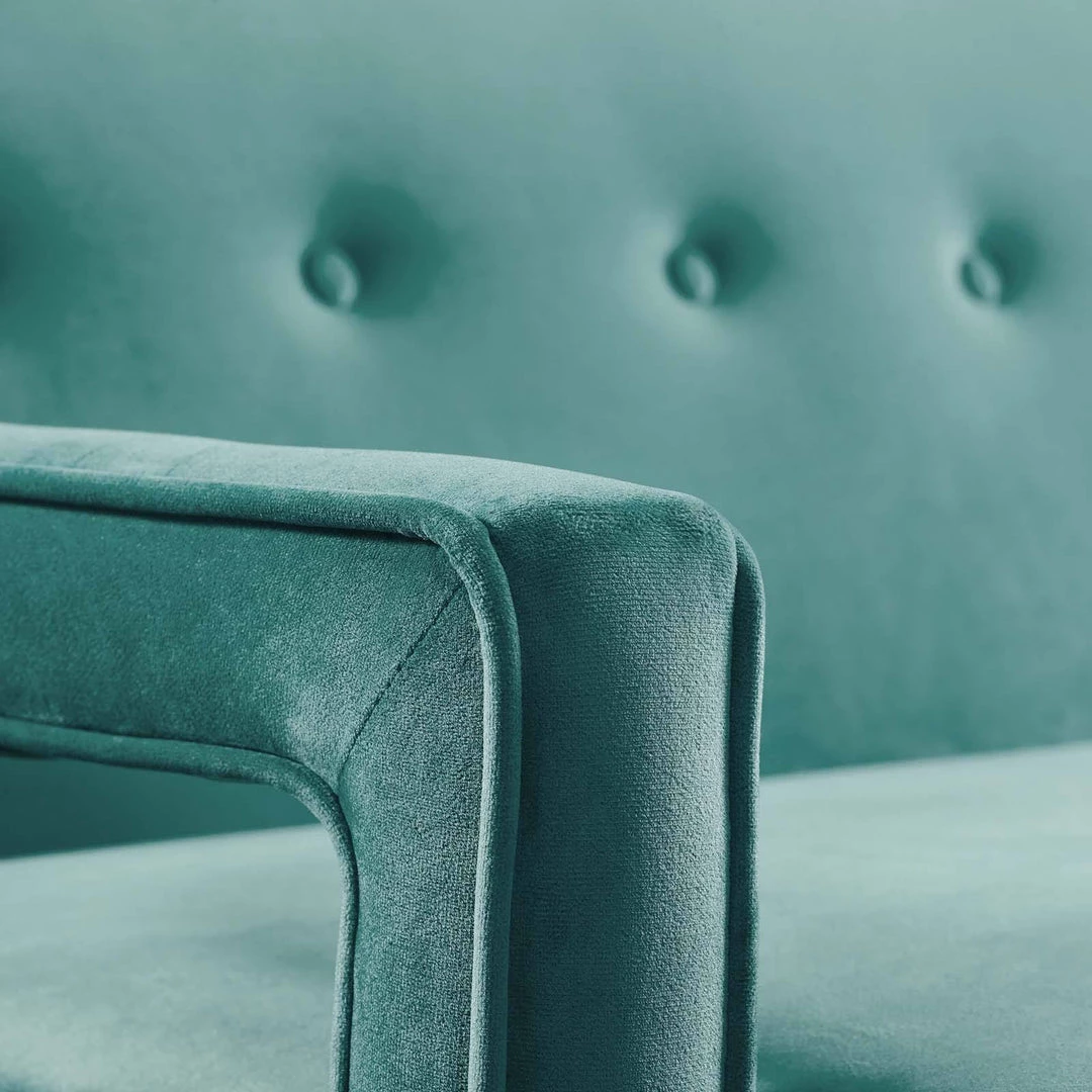 Elevate your home with the streamlined, chic cutout profile of the Concur Performance Velvet Sofa. Upholstered in soft, stain-resistant performance velvet, Concur comes with a plush 6″ thick, three-seater cushion, machine washable cover, and solid birch wood saber legs with non-marking foot caps. Adorned with sloping armrests, a tailored profile, and classic button tufting, this upholstered living room sofa makes a striking statement in a variety of modern and mid-century themed decors. Sofa Weight Capacity: 1323 lbs.