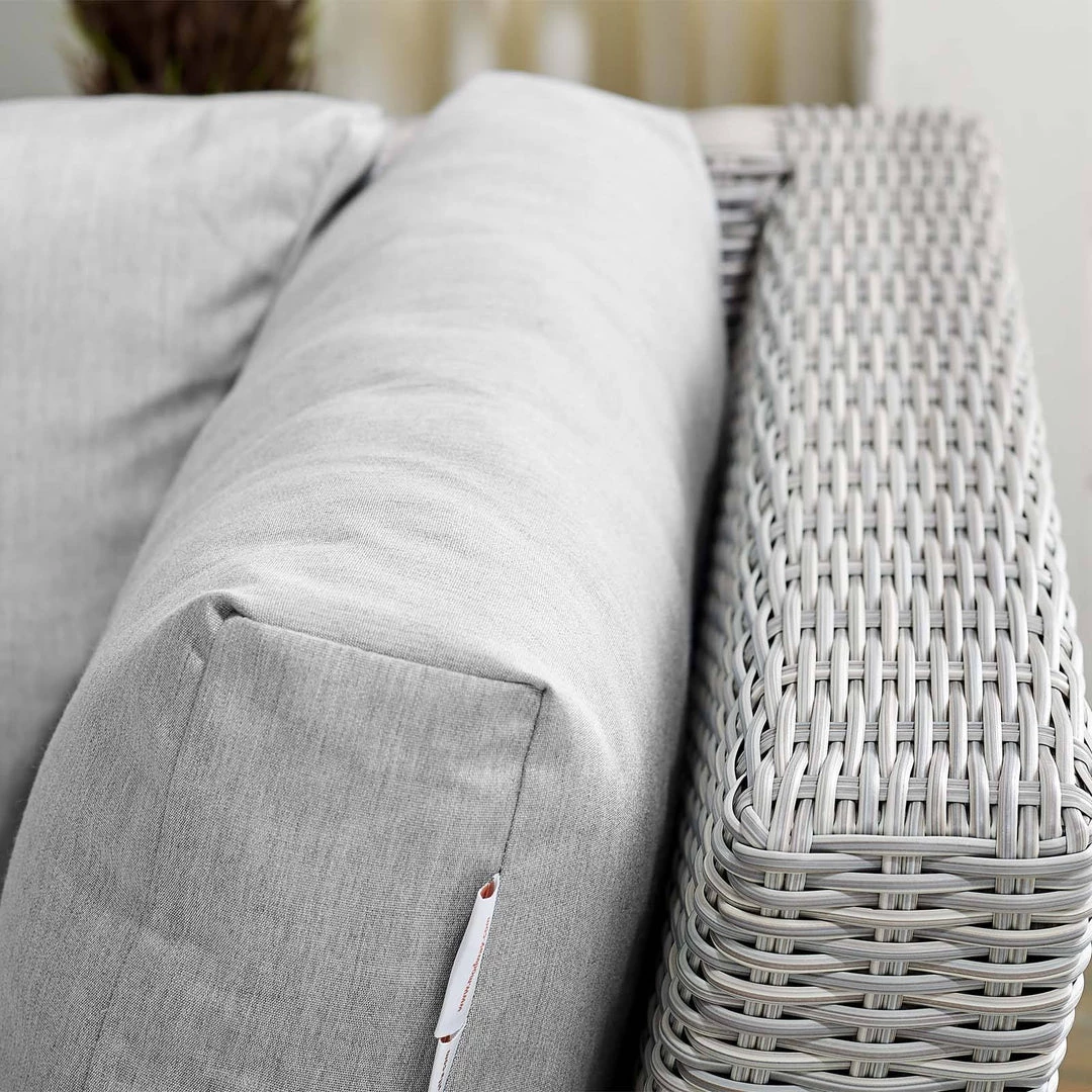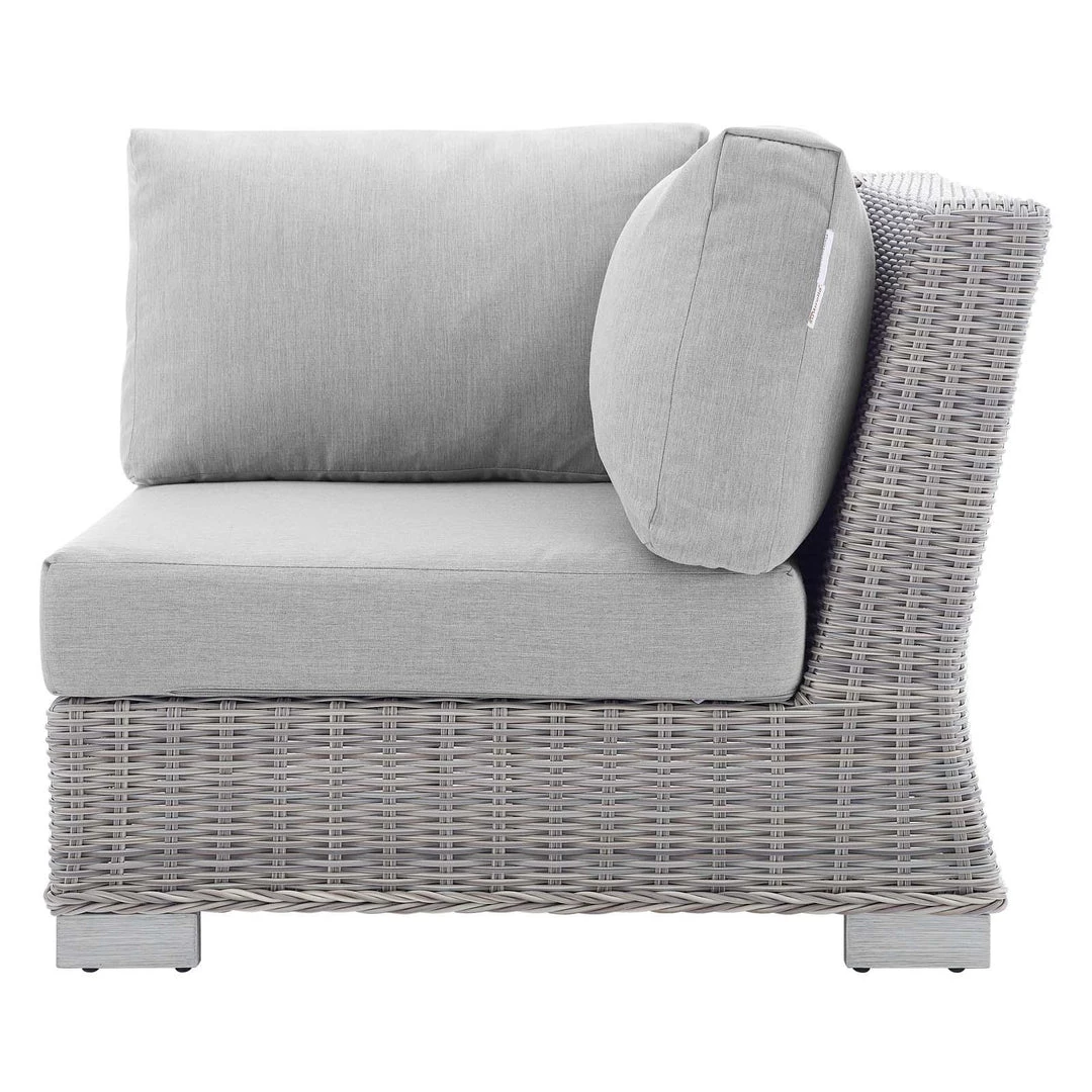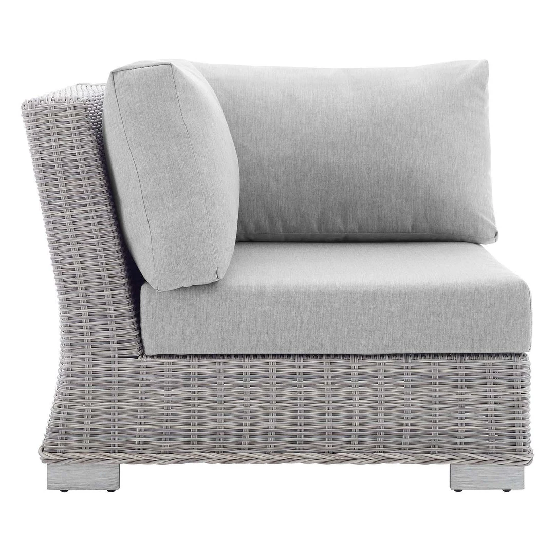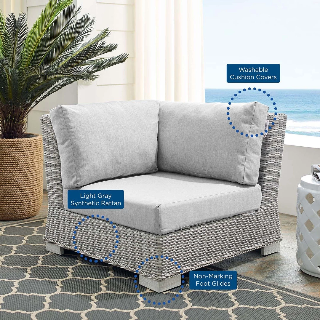 Enjoy fresh air and alfresco relaxation with the Conway Outdoor Patio Wicker Rattan Corner Sectional Sofa Chair. Wrapped in UV-resistant light gray synthetic wicker rattan, this sectional sofa piece boasts organic texture and a neutral hue that brings a calming presence to your outdoor area with a modular design that adapts to variety of configurations to suit your space. The frame of this outdoor chair is crafted with durable powder-coated aluminum and rests on L-shaped legs with plastic foot glides. Thick foam padded cushions covered with washable water-resistant Sunbrella® fabric covers offer a comfortable seat and affix securely to the corner chair with cord tension attachments. Trending aesthetics and a classic design define this outdoor patio furniture collection making it a beautiful addition to any outdoor space including the backyard, patio, porch, balcony, or poolside. Assembly required. Patio Chair Weight Capacity: 300 lbs.