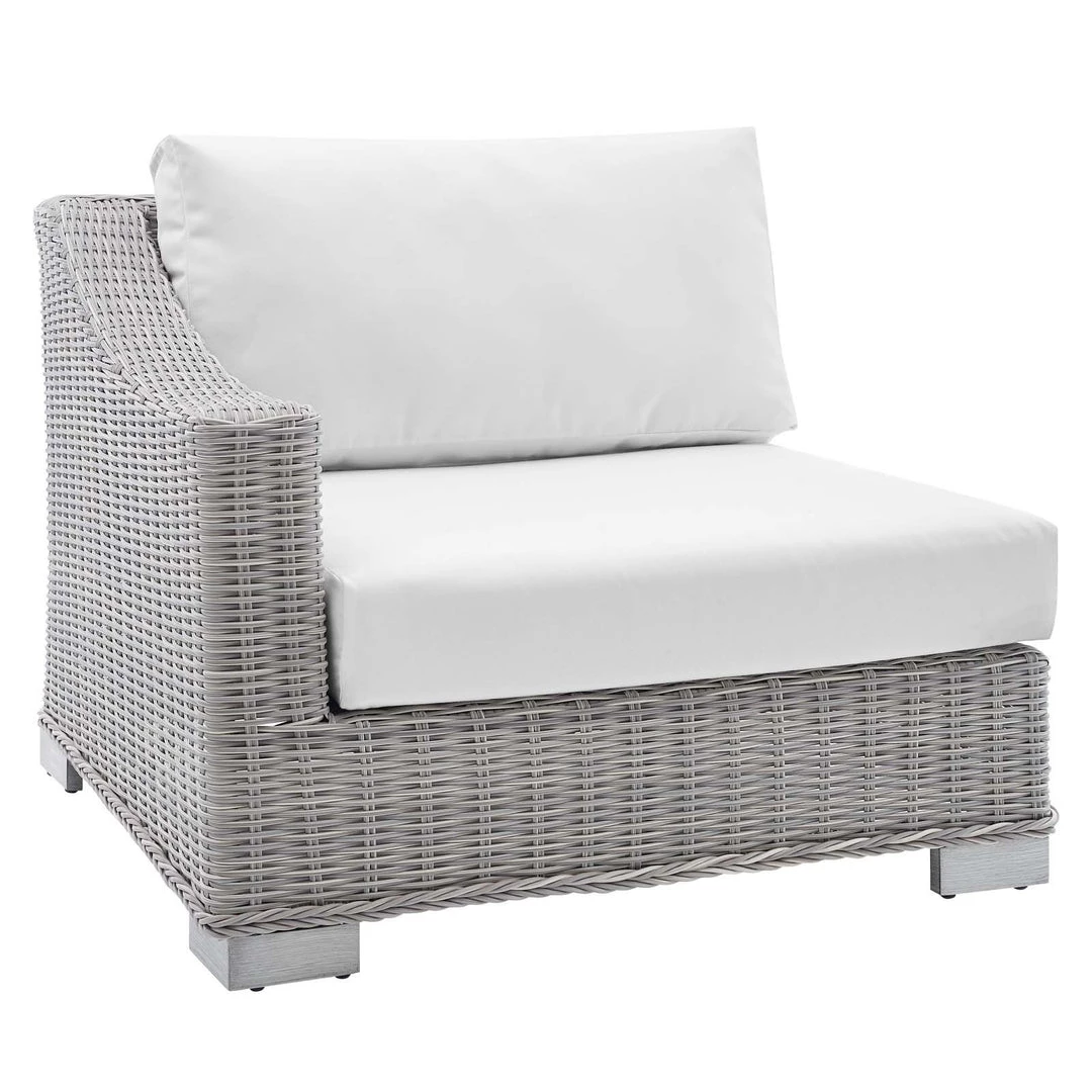 Enjoy fresh air and alfresco relaxation with the Conway Outdoor Patio Wicker Rattan Left-Arm Sectional Sofa Chair. Wrapped in UV-resistant light gray synthetic wicker rattan, this sectional sofa piece boasts organic texture and a neutral hue that brings a calming presence to your outdoor area with a modular design that adapts to variety of configurations to suit your space. The frame of this outdoor chair is crafted with durable powder-coated aluminum and rests on L-shaped legs with plastic foot glides. Thick foam padded cushions covered with washable water-resistant Sunbrella® fabric covers offer a comfortable seat and affix securely to the left-arm chair with cord tension attachments. Trending aesthetics and a classic design define this outdoor patio furniture collection making it a beautiful addition to any outdoor space including the backyard, patio, porch, balcony, or poolside. Assembly required. Patio Chair Weight Capacity: 300 lbs.