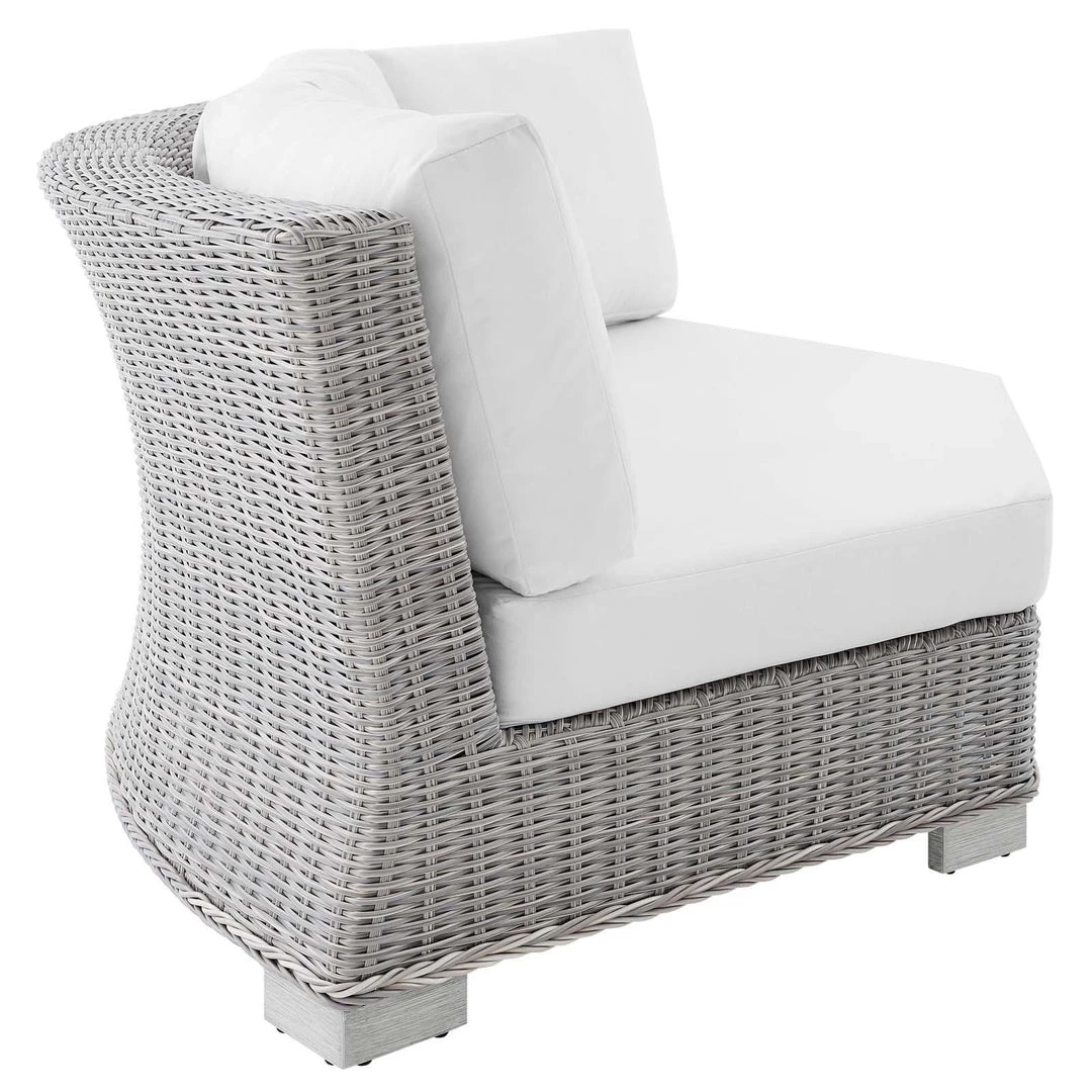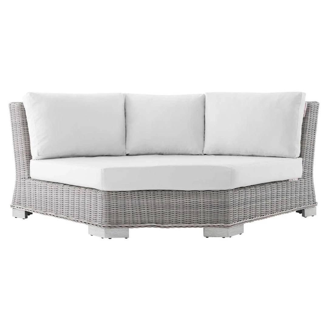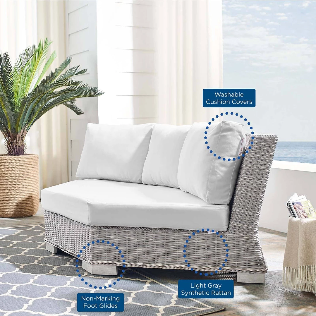 Enjoy fresh air and alfresco relaxation with the Conway Outdoor Patio Wicker Rattan Sectional Sofa Round Corner Chair. Wrapped in UV-resistant light gray synthetic wicker rattan, this sectional sofa piece boasts organic texture, rounded back, and a neutral hue that brings a calming presence to your outdoor area with a modular design that adapts to variety of configurations to suit your space. The frame of this outdoor chair is crafted with durable powder-coated aluminum and rests on L-shaped legs with plastic foot glides. Thick foam padded cushions covered with washable water-resistant Sunbrella® fabric covers offer a comfortable seat and affix securely to the corner chair with cord tension attachments. Trending aesthetics and a classic design define this outdoor patio furniture collection making it a beautiful addition to any outdoor space including the backyard, patio, porch, balcony, or poolside. Assembly required. Patio Corner Chair Weight Capacity: 600 lbs.