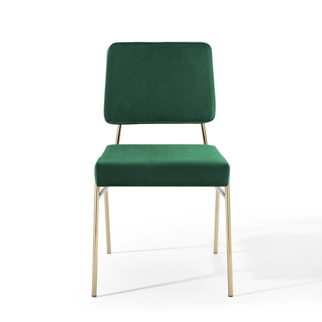 The blended aesthetics of mid-century modern style and the elegance of vintage glamour are channeled to create the striking Craft Performance Velvet Upholstered Dining Side Chair. Featuring dual densely padded foam cushions covered in soft and stain-resistant performance velvet polyester upholstery, this dining chair is a luxurious seating experience with an open, breathable design. The Craft Accent Chair sits on an eye-catching gold stainless steel frame with flared rear legs and non marking foot caps elevating your dining room, lounge room, and office decor. Chair Weight Capacity: 330 lbs. Comes Fully Assembled.