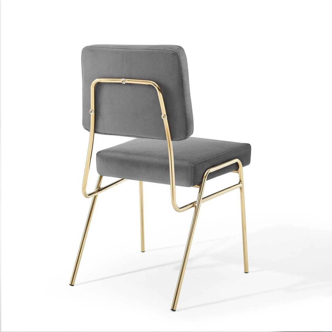 The blended aesthetics of mid-century modern style and the elegance of vintage glamour are channeled to create the striking Craft Performance Velvet Upholstered Dining Side Chair. Featuring dual densely padded foam cushions covered in soft and stain-resistant performance velvet polyester upholstery, this dining chair is a luxurious seating experience with an open, breathable design. The Craft Accent Chair sits on an eye-catching gold stainless steel frame with flared rear legs and non marking foot caps elevating your dining room, lounge room, and office decor. Chair Weight Capacity: 330 lbs. Comes Fully Assembled.