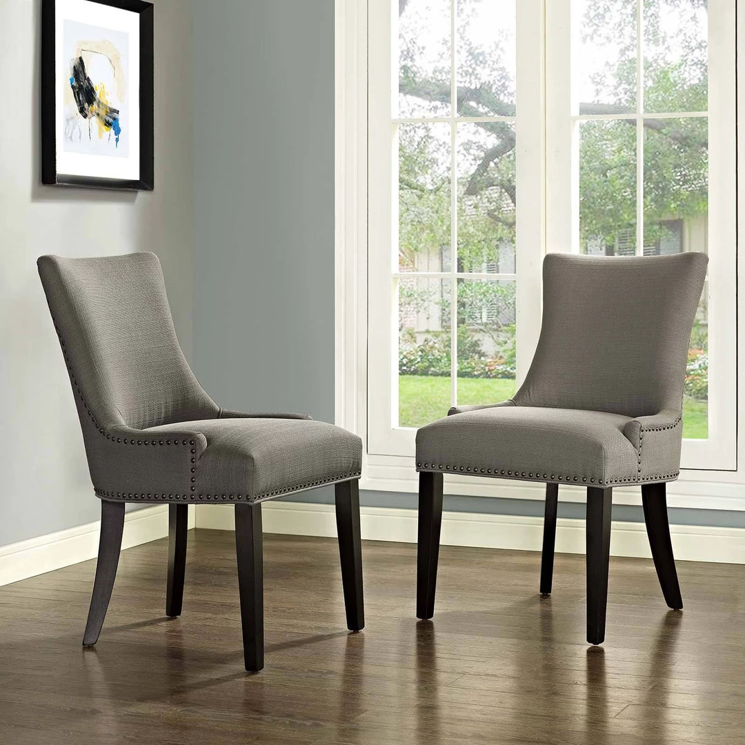 Inspire your décor with the Marquis Dining Side Chair. Marquis is fashioned with a chic hourglass shaped back, studded nailhead trim, non-marking foot caps, tapered wood legs, and a regal seat generously padded in foam and upholstered in polyester fabric. Marquis works well in both modern and traditional dining rooms.
