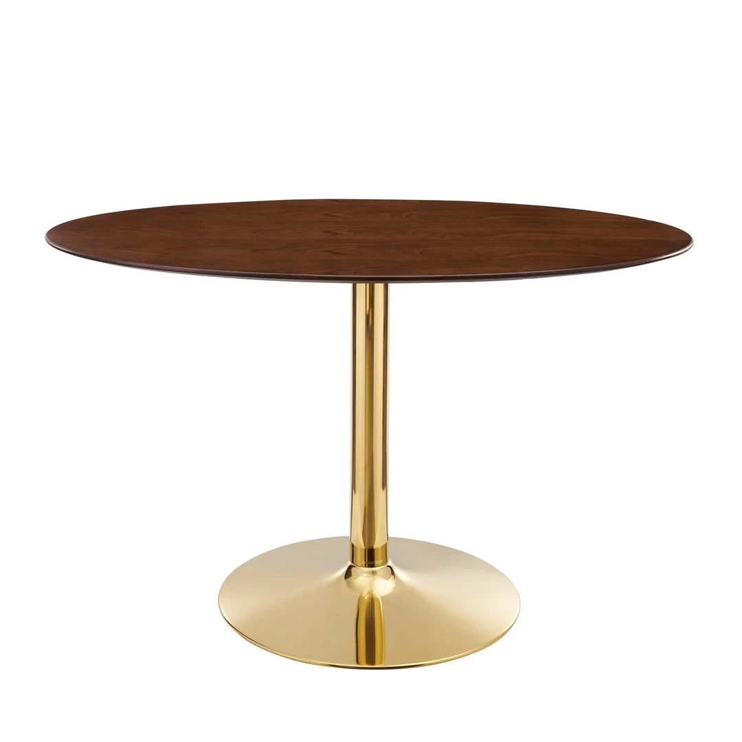 Gather family and friends for good food and conversation around the Verne Dining Table. Bringing modern influence and mid-century inspiration to your dining space, this pedestal table reflects an organic shape. Perfect for entertaining or everyday dining, this dining table rests on a polished gold metal pedestal base and features a 48″ tabletop crafted with MDF and easy-to-clean walnut veneer. Non-marking foot ring to protect flooring. Assembly required.