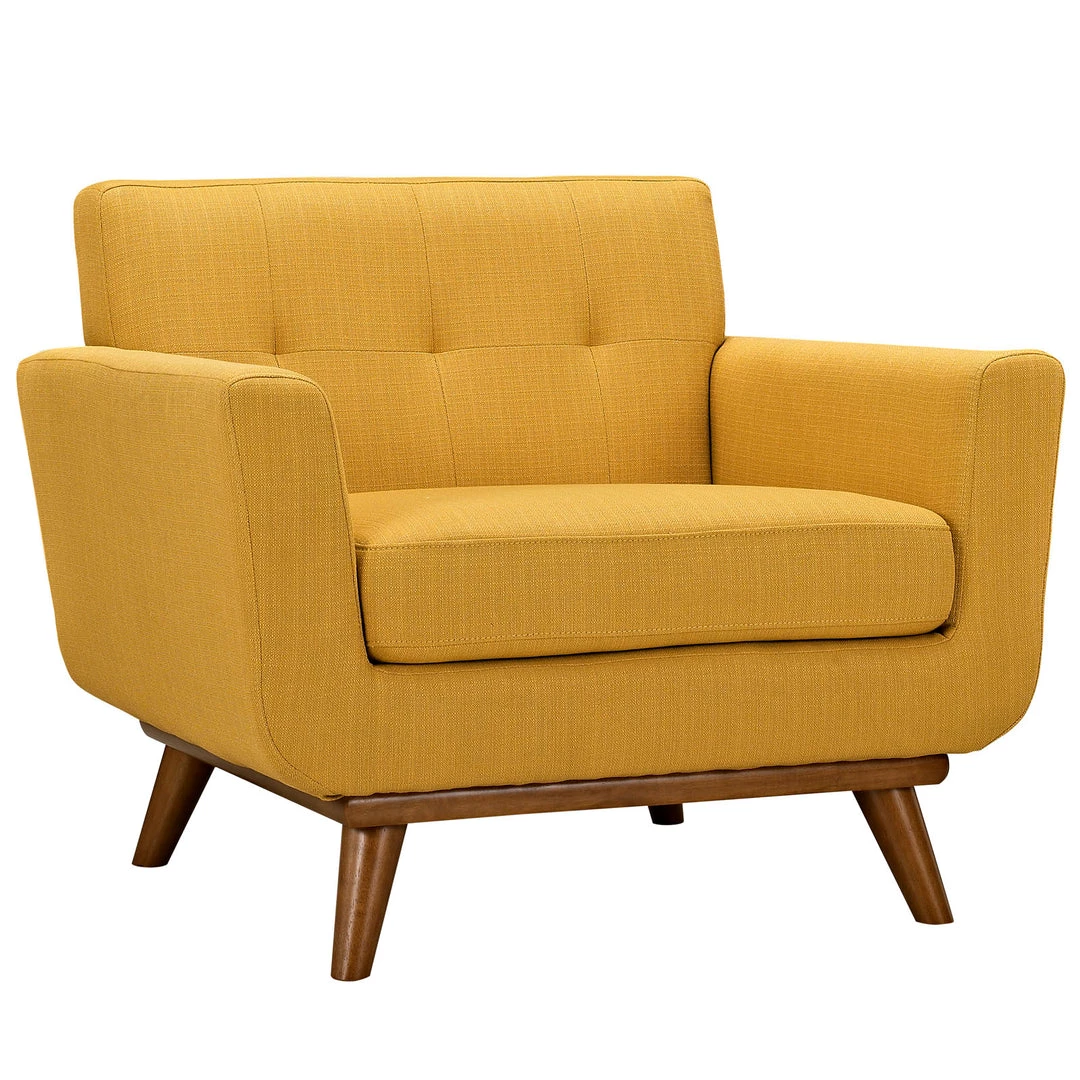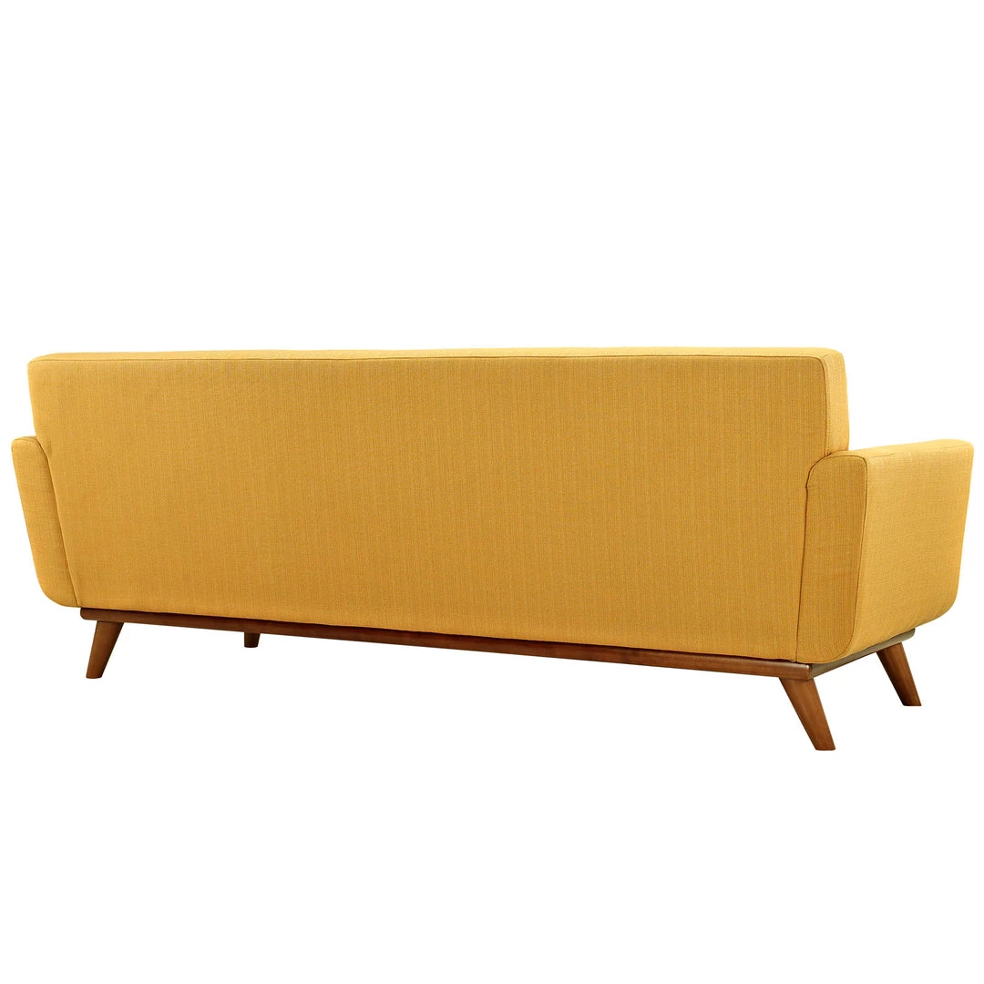 Gently sloping curves and large dual cushions create a favorite lounging spot. Whether plopping down after a long day at work, settling in with coffee and brunch, or entering a spirited discussion with friends, the Engage sofa is a welcome presence in your home. Seven tufted buttons create eye-catching appeal, adding depth that brings your sitting décor to center stage. Four cherry color rubberwood legs and frame supply a solid base to the comfortable upholstered material.