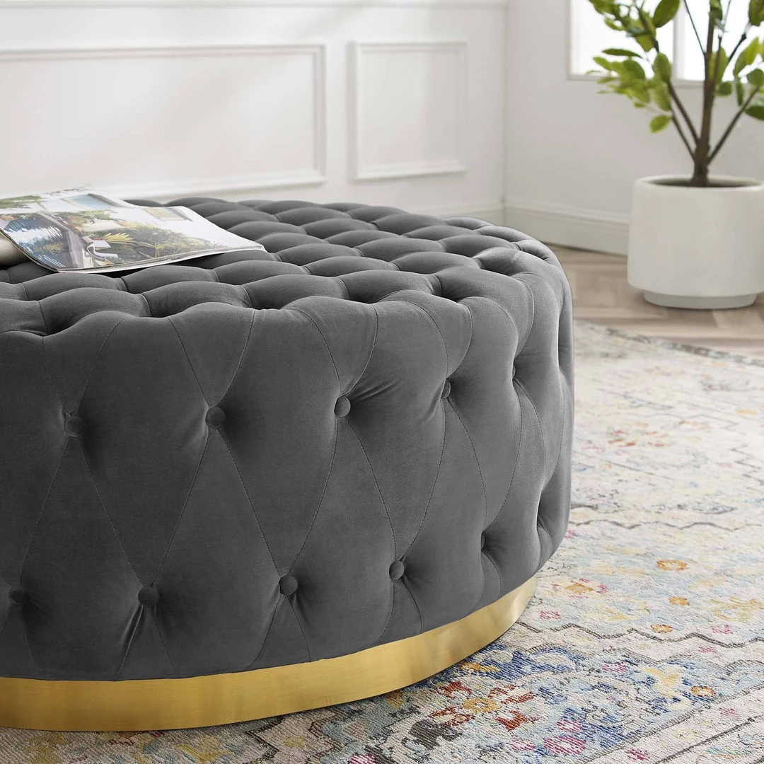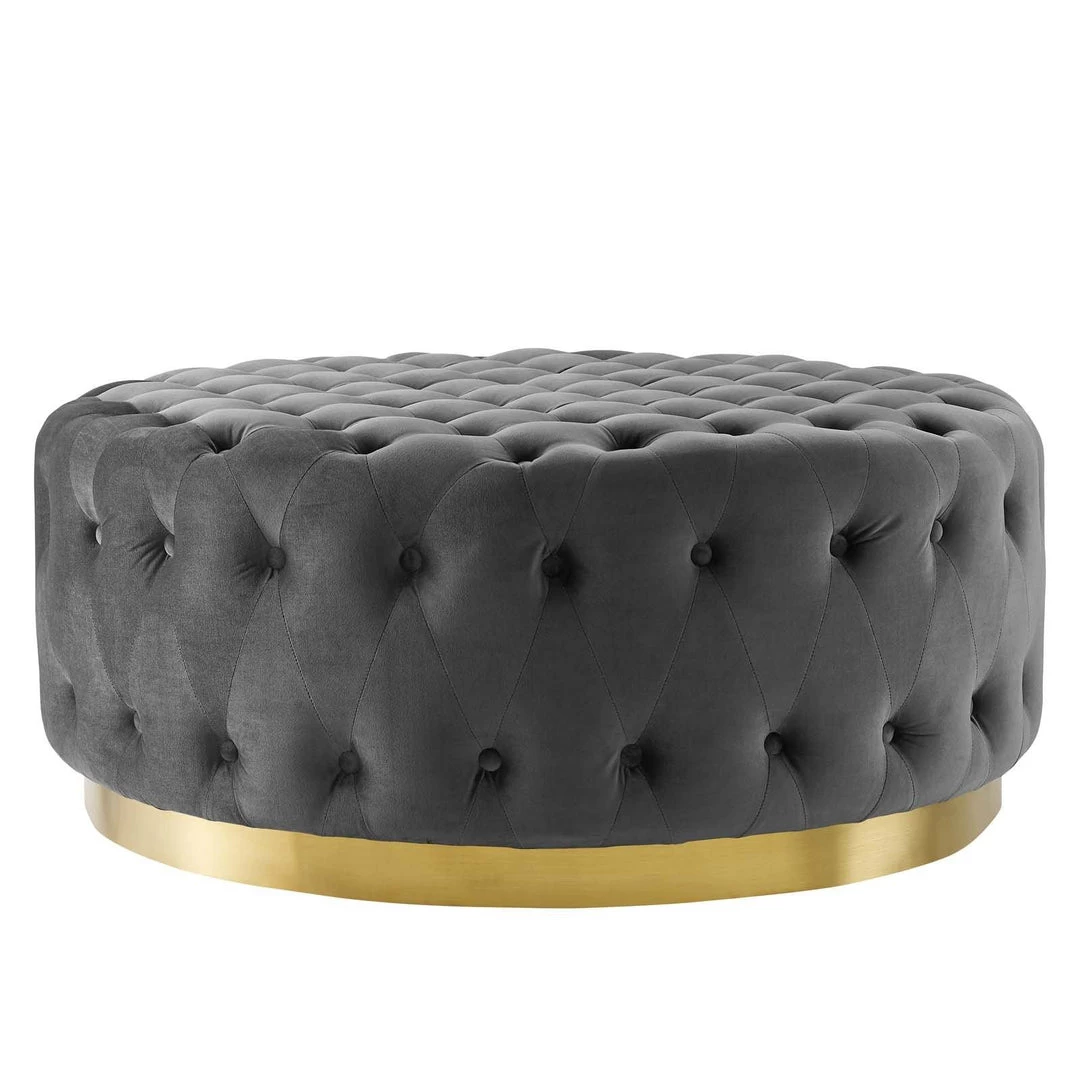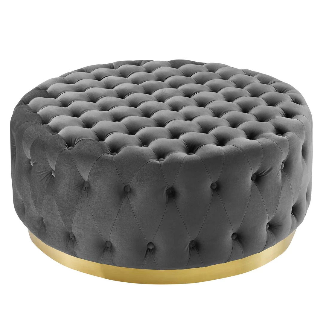Revive decor in your living space with the Ensconce Tufted Performance Velvet Round Ottoman. Rich in tactile luxury and glam deco style, this round ottoman features deep button tufting and gold metal accents, and serves as both a comfortable choice for extra seating space or a unique coffee table in your living room. Covered in soft, stain-resistant performance velvet, this upholstered ottoman is densely padded in foam and rests atop a sturdy gold stainless steel base. Complete with plastic foot caps to protect flooring. Weight Capacity: 300 lbs.