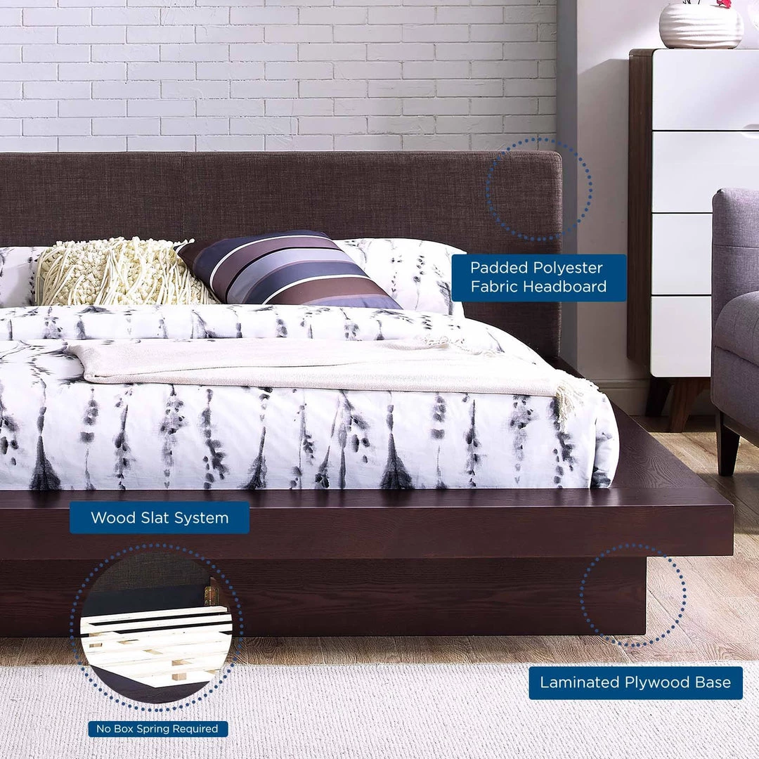Instantly transform your bedroom landscape with the Freja Platform Bed. Designed with clean straight lines and a compelling aesthetic, Freja features a sturdy laminated particleboard base with cappuccino veneer, foam-padded headboard upholstered in polyester fabric, slatted support that eliminates the need for a box spring, and a reinforced center beam with supporting legs for maximal stability. Update your bedroom décor with an engaging platform bed which evinces a refined look and striking design. Freja admirably supports mattress types such as memory foam, spring, latex, and hybrid. Mattress Not Included.