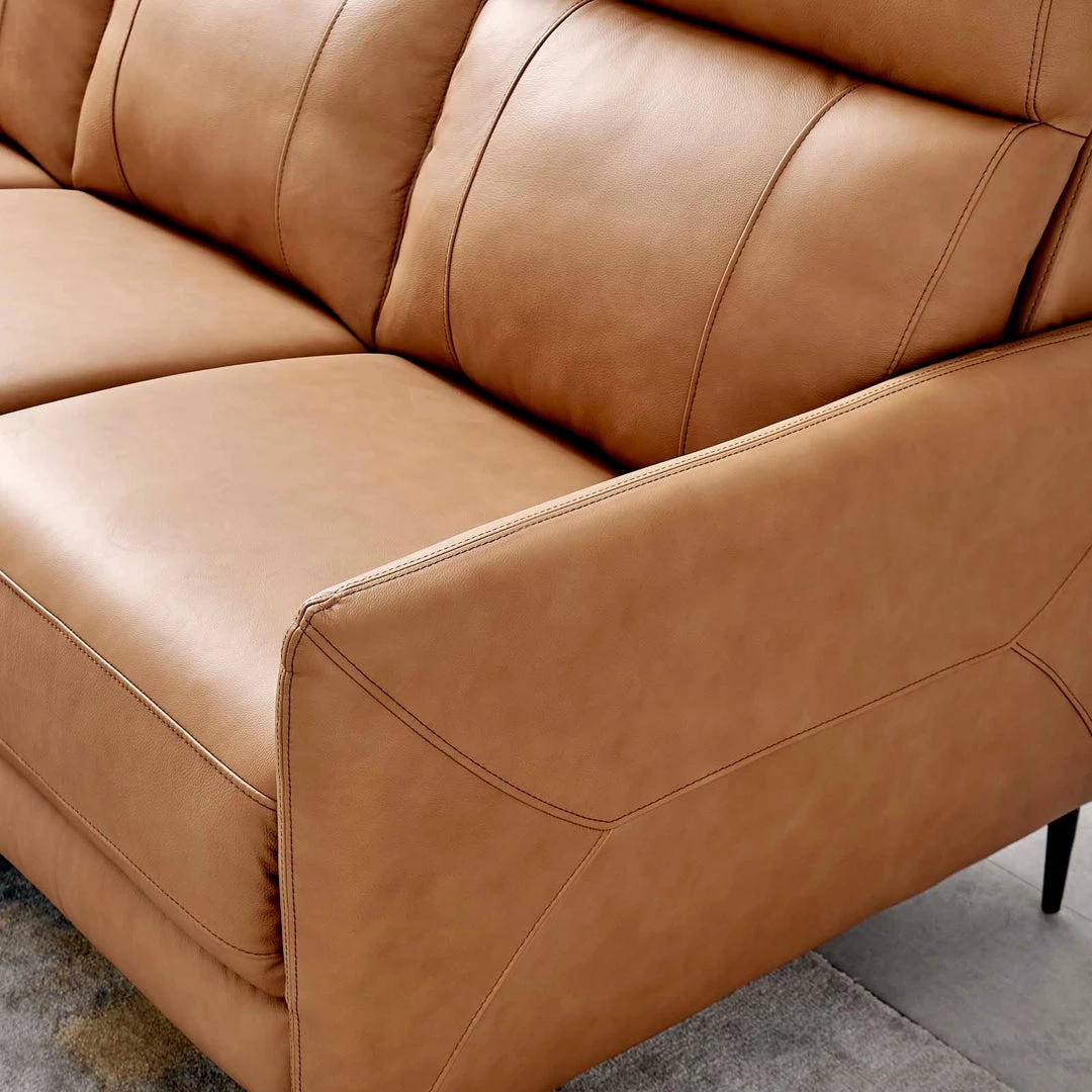 Bring luxe comfort and rich style to your living room, bedroom sitting area, or office with the Huxley Leather Sofa. With a high back design perfect for long lasting support, this leather sofa abounds in modern charm and practical functionality. Upholstered in comfortable quality leather, this living room sofa is complete with dense foam padding and a no-sag spring support system. The frame of this leather sofa is crafted with solid wood, and it rests on black powder-coated steel legs with non-marking foot pins. Weight Capacity: 900 lbs.