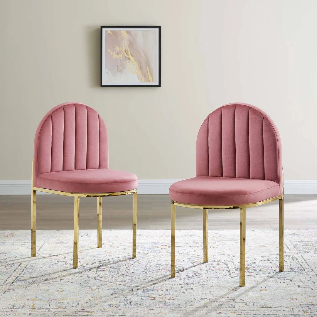 Reinvent your dining room decor with the vintage glamour of the Isla Channel Tufted Performance Velvet Upholstered Dining Room Side Chair. Featuring a vintage clamshell design and the bold lines of channel tufted accents, the Isla Dining Accent Chair is a piece to be remarked upon by guests and friends. Dense foam padding provides a comfortable seat, while soft and stain-resistant performance velvet polyester upholstery creates a luxe elegance for long-lasting use. The curved gold stainless steel frame on the Isla Side Chair has four legs with non-marking foot caps to protect flooring. Chair Weight Capacity: 331 lbs.