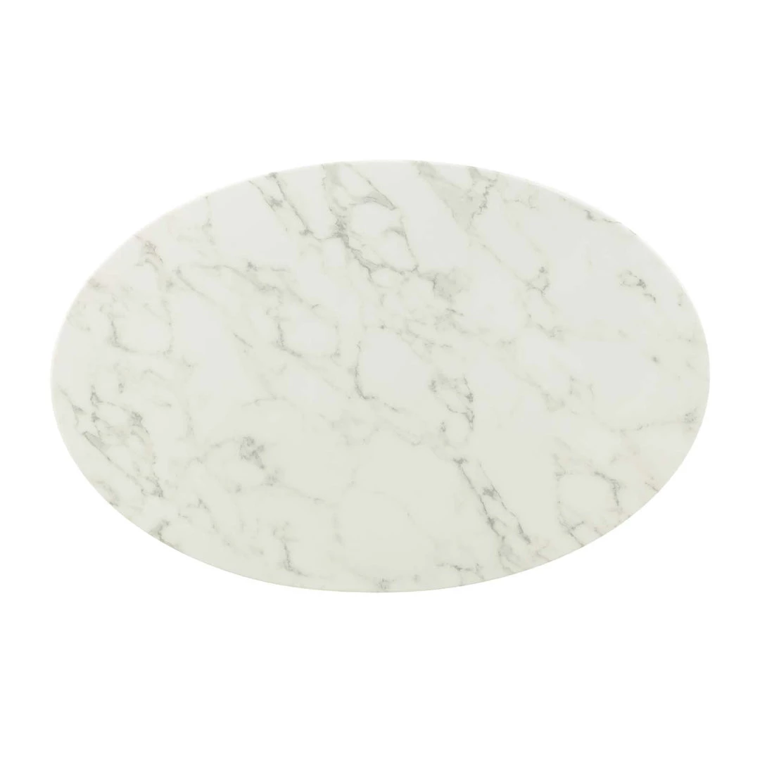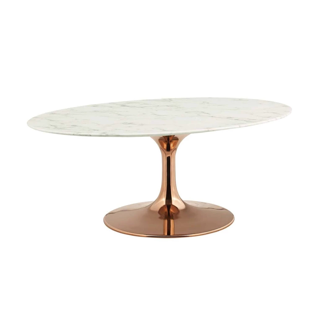 Reflecting a seamless organic shape and timeless form, the Lippa coffee table has become a symbol of modernism for over the past 60 years. Before its release, homes were filled with clunky remnants of an industrial age long gone by. But in order to advance into the new world, homes first had to transition from the traditional square table, into a piece that connoted progress. The base and dimensions are true to the original specifications, while the table’s oval-shaped artificial marble top, and tapered metal base, are carefully lacquered with a scratch and chip resistant finish.