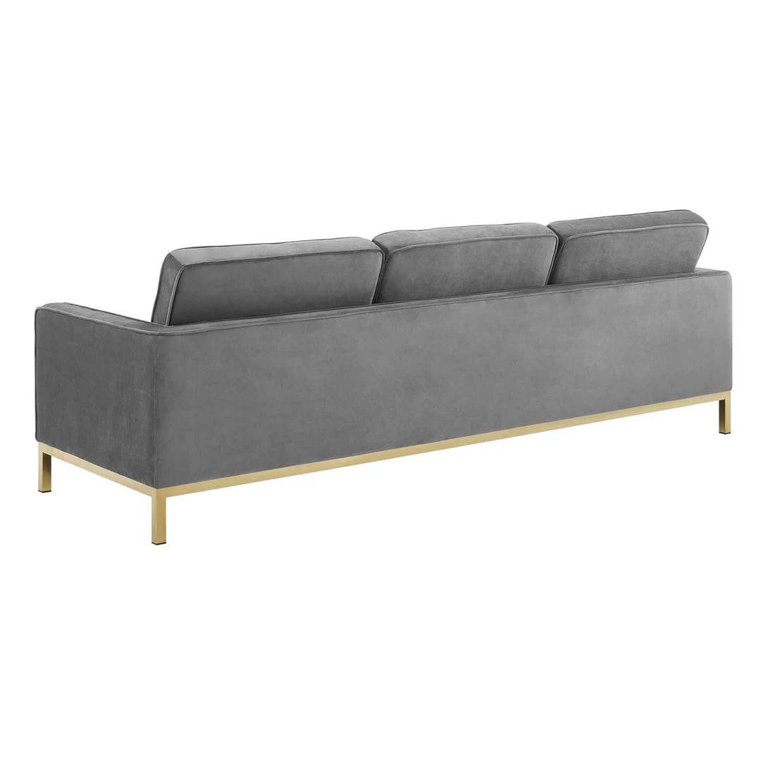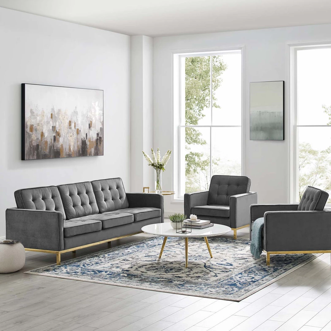 Revolutionize your living room furniture with the iconic Loft Gold Stainless Steel Leg Performance Velvet Sofa and 2 Armchair Set. Adding visual depth to your living room or lounge space, Loft features soft and durable performance velvet upholstery accented in elegant button tufting. This modern living room set comes in a captivating linear design with an external tubular stainless steel frame, four gold stainless steel legs, and non-marking foot caps. Inspired by the richness of mid-century modern style, Loft is the preferred choice of living rooms and lounge spaces.
