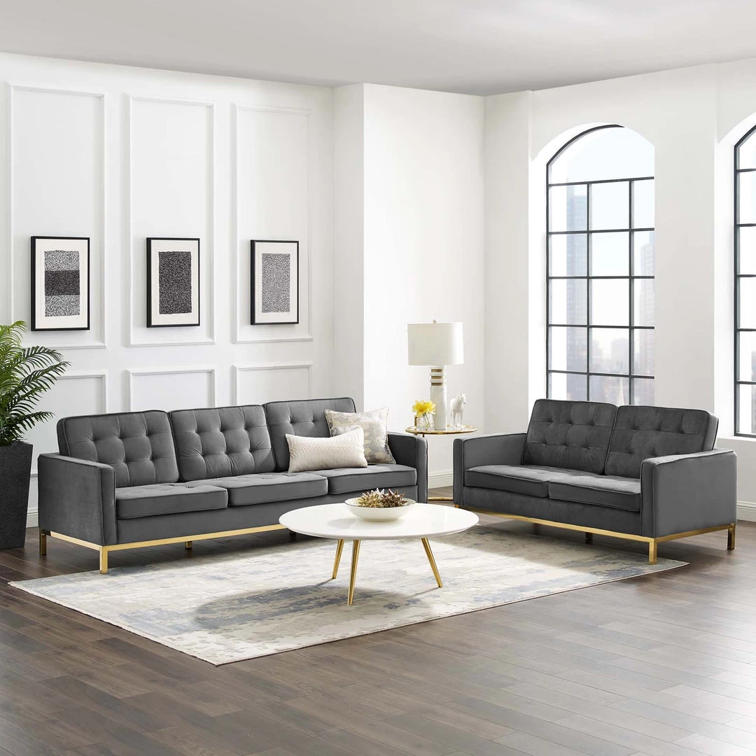 Revolutionize your living room furniture with the iconic Loft Gold Stainless Steel Leg Performance Velvet Sofa and Loveseat Set. Adding visual depth to your living room or lounge space, Loft features soft and durable performance velvet upholstery accented in elegant button tufting. This retro modern living room set comes in a captivating linear design with an external tubular stainless steel frame, four gold stainless steel legs, and non-marking foot caps. Inspired by the richness of mid-century modern style, Loft is the preferred choice of living rooms and lounge spaces.