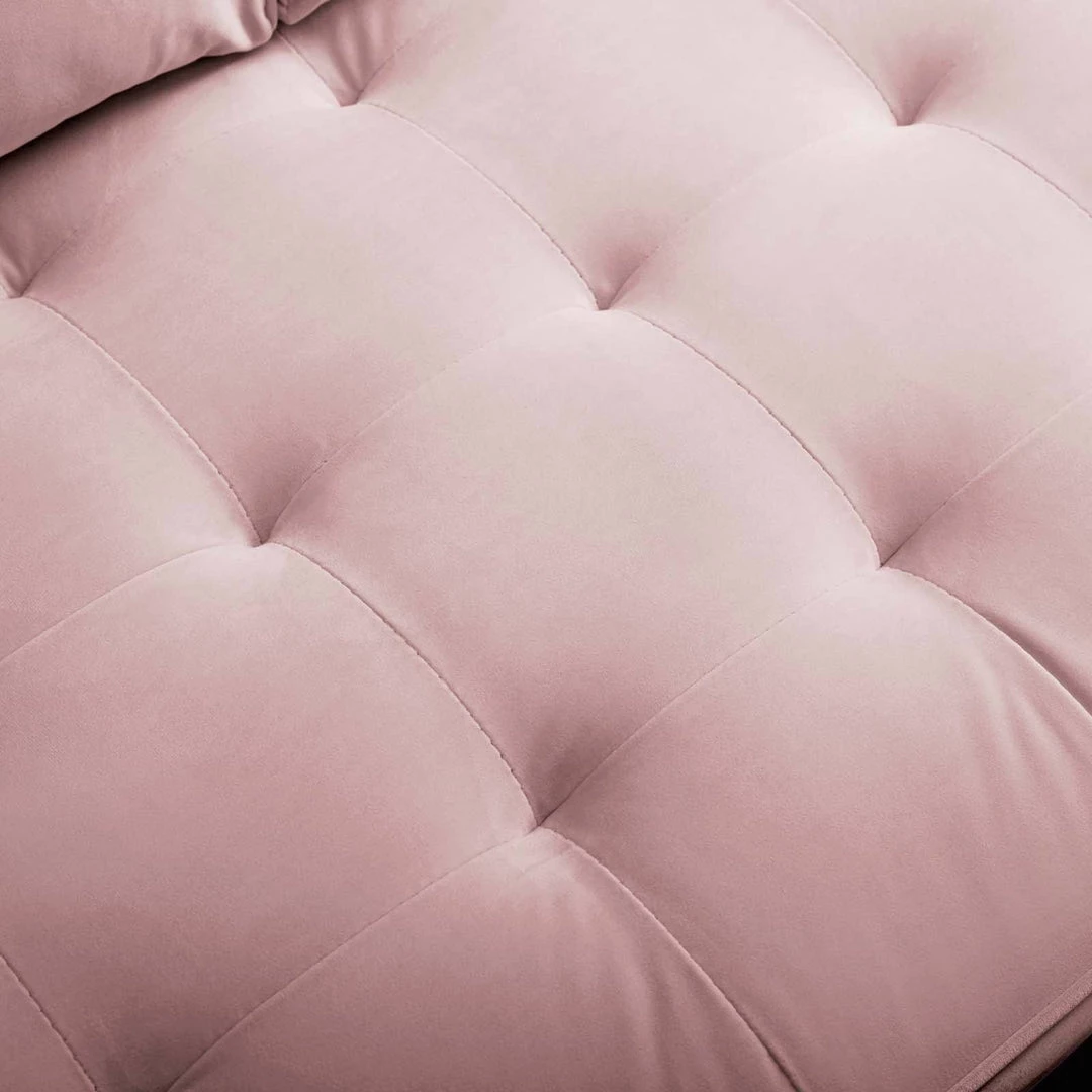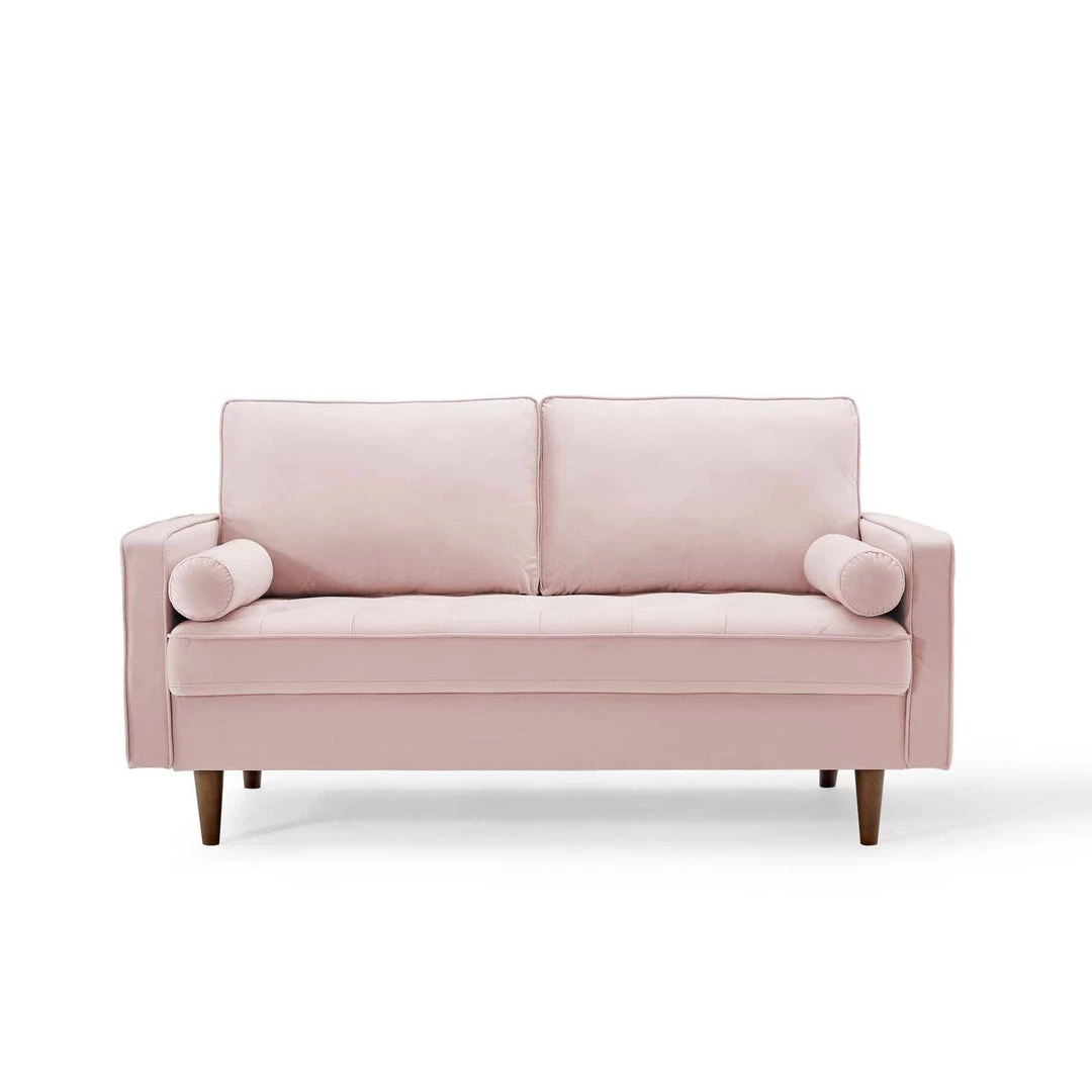 Update your home or apartment with the mid-century style and modern-day convenience of Valour. This comfortable living room loveseat features a tailored profile with elegant biscuit tufting and two bolster pillows. Covered in soft, stain-resistant performance velvet upholstery, Valour has dense foam padding, individually wrapped innerspring pocket coils, and sinuous spring support for a comprehensive seating experience. This luxe modern two-seater sofa comes with walnut-stained wood legs with non-marking foot caps and supports up to 600 lbs. Say goodbye to the days of hauling heavy furniture. This tufted loveseat ships in a portable box for easy maneuvering.