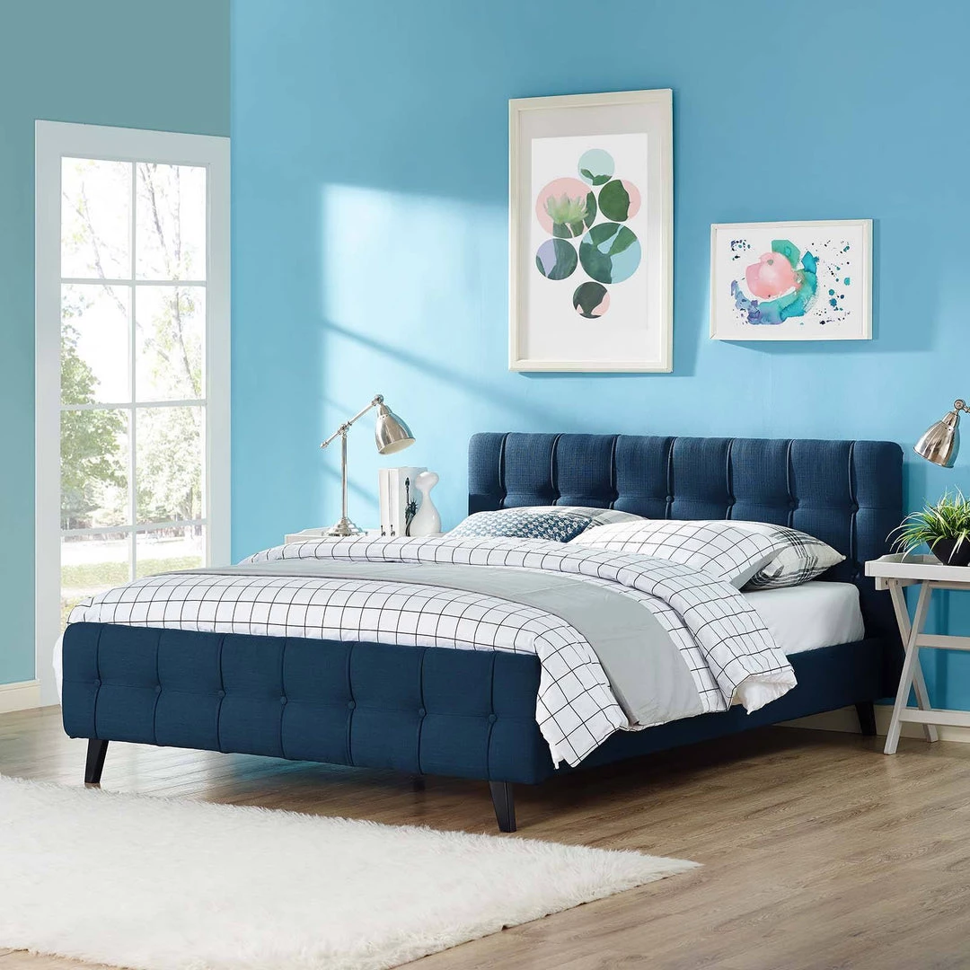 Restyle your bedroom décor with the Ophelia Platform Bed. Designed with luxury chic button tufted headboard and footboard, Ophelia comes upholstered in polyester featuring elegant trimming, black stained wood legs, and a slatted wood support system that eliminates the need for a box spring. Complete with a reinforced center beam with supporting legs for maximum stability, the Ophelia integrated bed frame accommodates the various mattress types on the market such as memory foam, spring, latex, and hybrid. A modern centerpiece to your bedroom, Ophelia is a quality modern bed poised to thoroughly transform your space. Weight capacity up to 1300 lbs. Mattress Not Included.