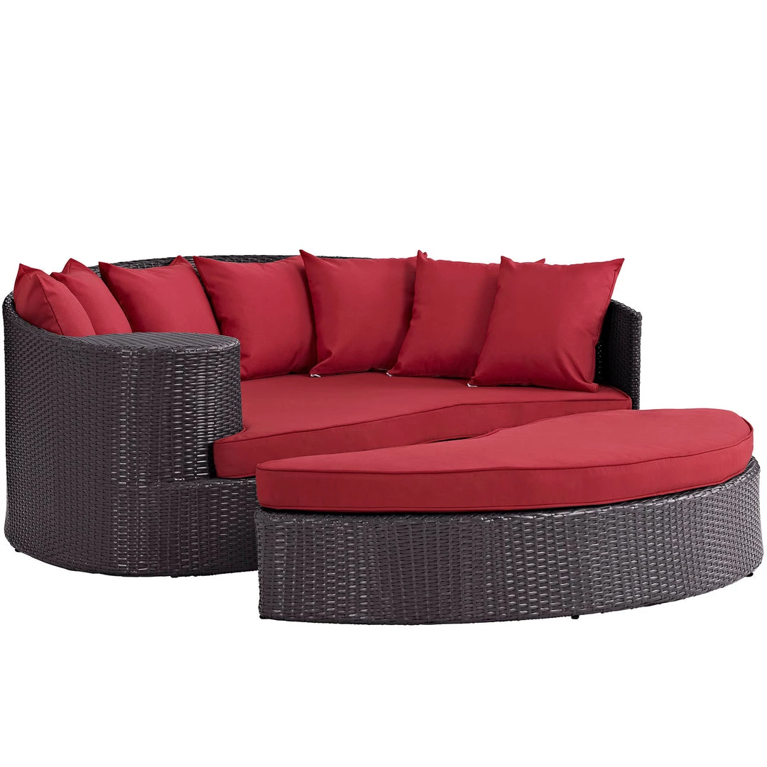 Gather stages of sensitivity with the Convene Outdoor Sectional series. Made with a synthetic rattan weave and a powder-coated aluminum frame, Convene Patio Lounge Daybed Sofa with Ottoman is a versatile outdoor piece that shifts and combines according to the spontaneous needs of the moment. Outfitted with all-weather fabric cushions, leave a positive impression on friends and family while enhancing your patio, backyard, or poolside repast in this series of palpable distinction. This installment of the series is an Outdoor Patio Lounge Daybed.