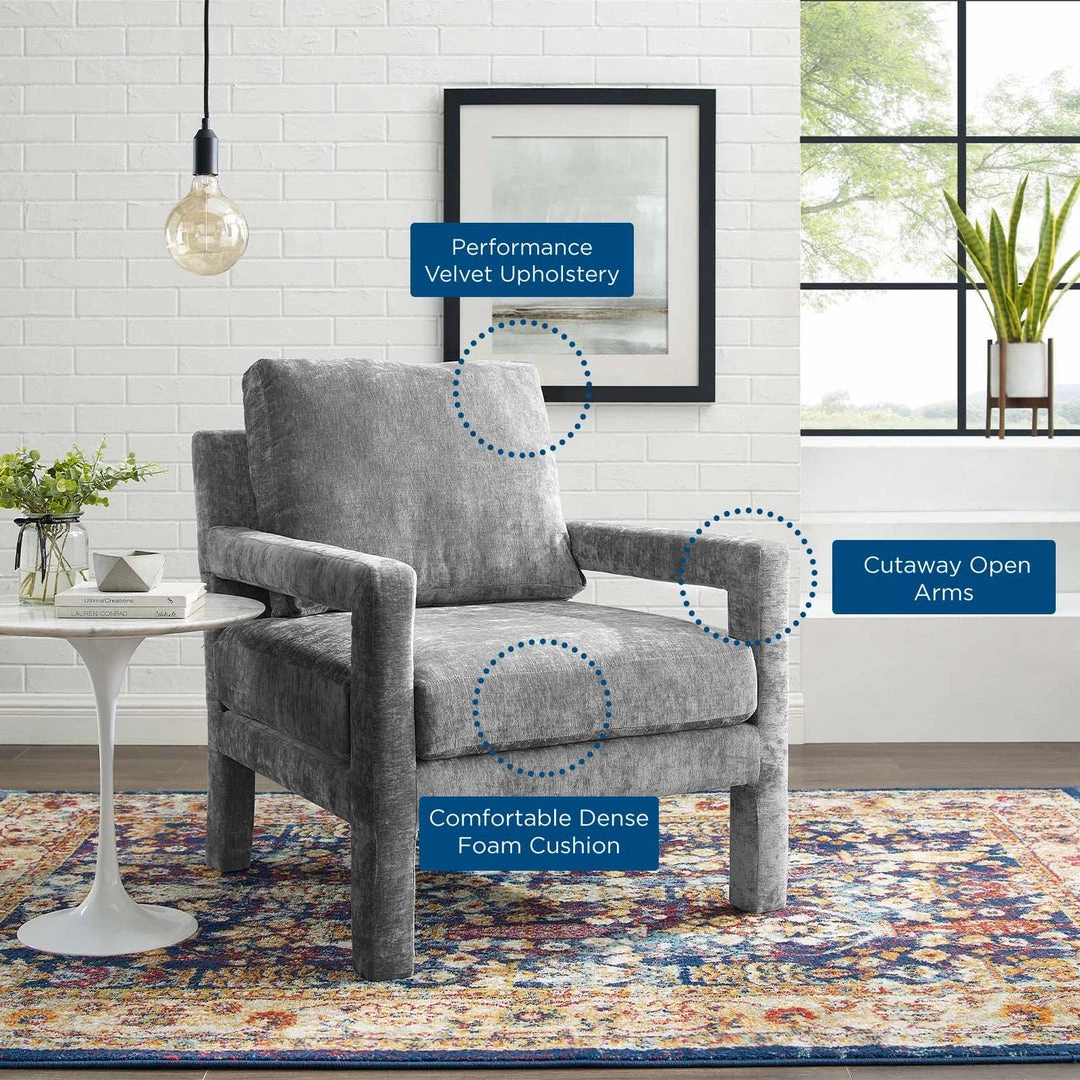 Bring the lush expanse of the Rehearse Crushed Performance Velvet Living Room Accent Armchair into your environs for an enhanced seating experience. The Rehearse Accent Chair has an elegantly fluid linear frame with padded cutaway open arms. Stain-resistant crushed performance velvet polyester upholstery covers the densely padded foam cushions for a premium living room chair guests will return to time and again. Resting securely on upholstered legs, Rehearse comes with four non-marking foot caps to protect flooring. Assembly Required. Chair Weight Capacity: 300 lbs.
