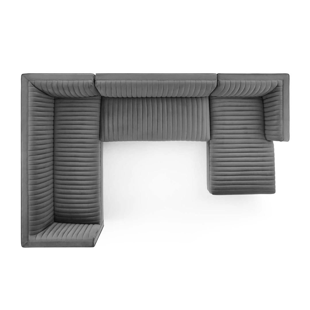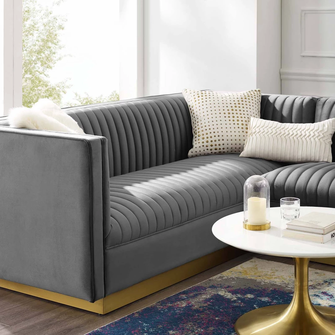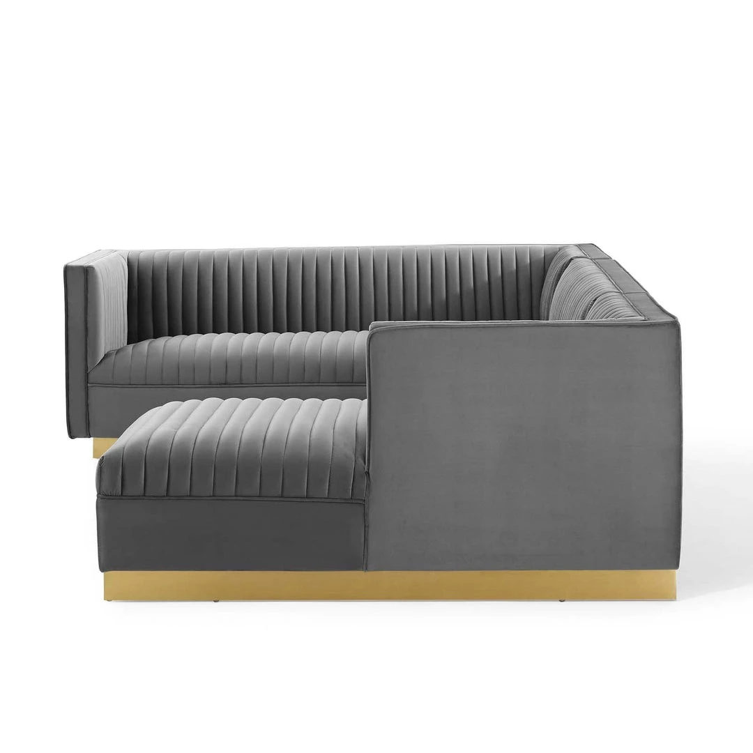 Glamour radiates from the organic linear design of the Sanguine Channel Tufted Performance Velvet Living Room Sectional Sofa Collection. Relax and follow the interior vertical channel tufting for a streamlined effect that adds retro modern glamour to your living room, lounge room, or home office. Soft, stain-resistant performance velvet upholstery creates a luxurious tactile experience while dense foam padding with individually wrapped spring coil system provides ultimate comfort and support for your customizable sofa furniture set. Solidly constructed from eucalyptus wood and plywood, this 3-piece sofa furniture set is an eye-catching addition. Sanguine Sectional Sofa Set’s palatial accents and premium comfort rest securely on a gold stainless steel base that complements any contemporary modern home or apartment. Maximum Weight Capacity: Sofa 1323 lbs., Armless 882 lbs., Chaise 882 lbs.