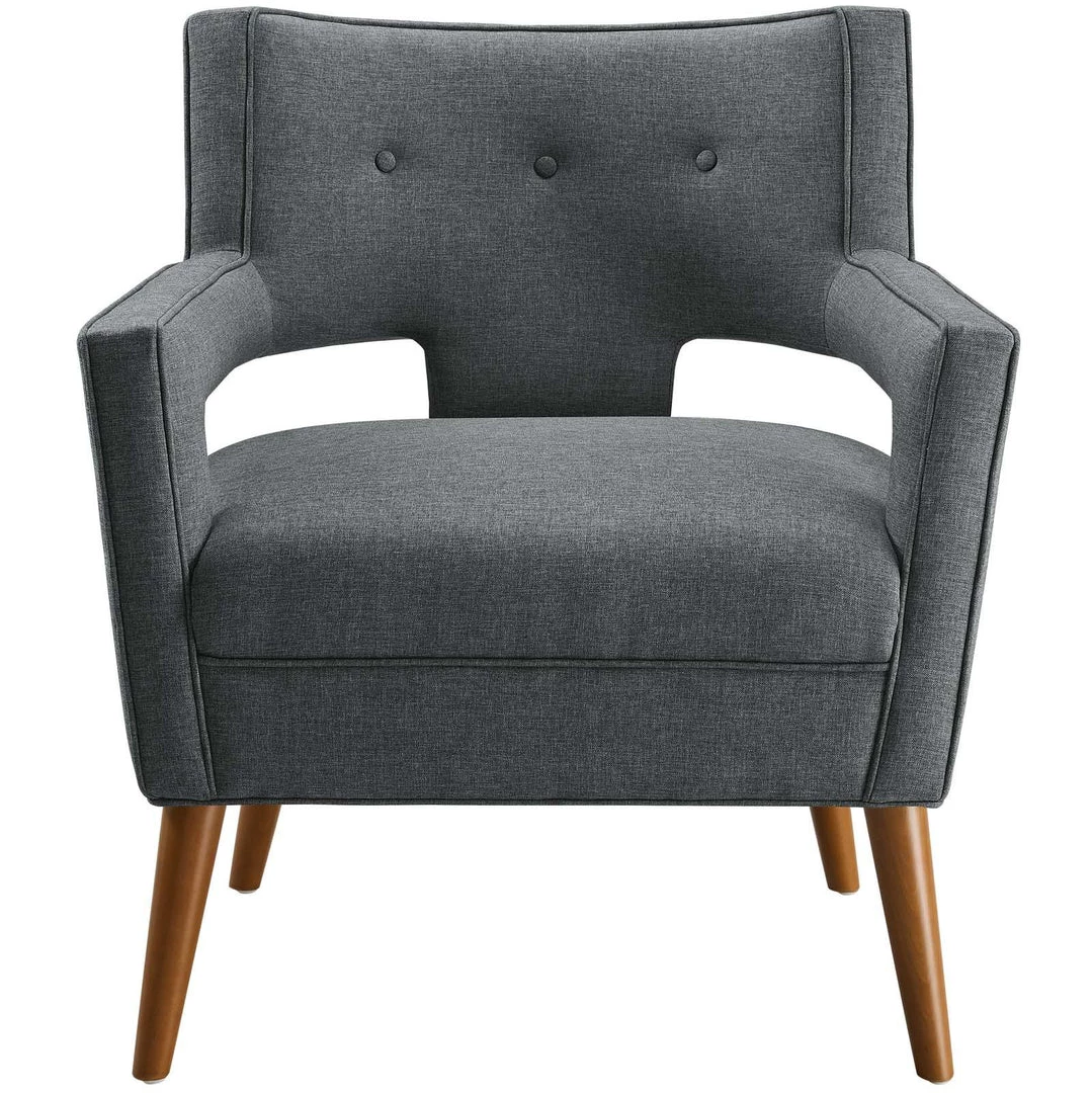 Carefully crafted simplicity and subtle sophistication blend to create the crafted simplicity of Sheer. A mid-century modern armchair upholstered in soft polyester fabric, Sheer features a streamlined profile and flared armrests for a striking silhouette. Complete with elegant button tufting and subtle piped trim, Sheer comes with dense foam padding positioned on a sinuous spring support system for exceptional comfort. Outfitted with tapered and splayed non-marking, cherry-stained wood legs, the Sheer Upholstered Fabric Armchair delivers the perfect seating area for the living room, home office, or entryway. Maximum Weight Capacity: 440 lbs.