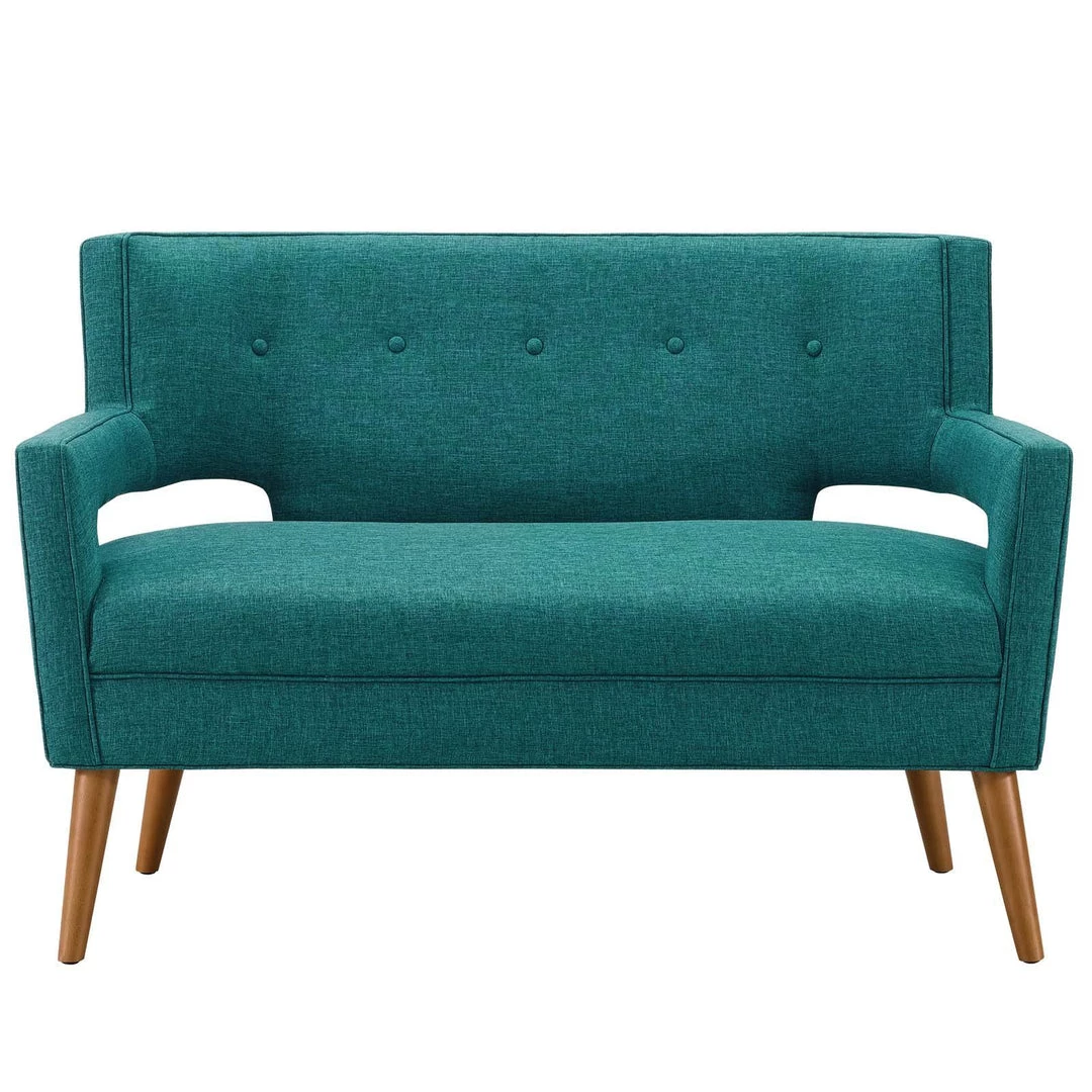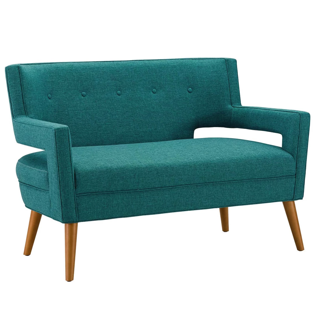 Carefully crafted simplicity and subtle sophistication blend to create the crafted simplicity of Sheer. A mid-century modern loveseat upholstered in soft polyester fabric, Sheer features a streamlined profile and flared armrests for a striking silhouette. Complete with elegant button tufting and subtle piped trim, Sheer comes with dense foam padding positioned on a sinuous spring support system for exceptional comfort. Outfitted with tapered and splayed non-marking, cherry-stained wood legs, the Sheer Upholstered Fabric Loveseat delivers the perfect seating area for the living room, home office, or entryway. Maximum Weight Capacity: 600 lbs.
