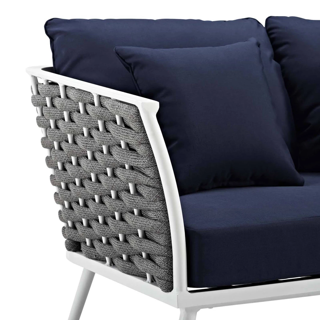 Gather family and friends for pleasant weather and good conversation with the Stance Outdoor Collection. Boasting a contemporary modern look, Stance features woven polyester fabric rope seat back and flared powder-coated aluminum frame, while waterproof all-weather fabric cushions with dense foam padding provide a relaxing spot to lounge. A versatile set designed for long-lasting durability, each piece in the Stance Collection can be mixed and matched and effortlessly arranged to fit the spontaneous needs of you and your guests. Sofa Weight Capacity: 551 lbs.