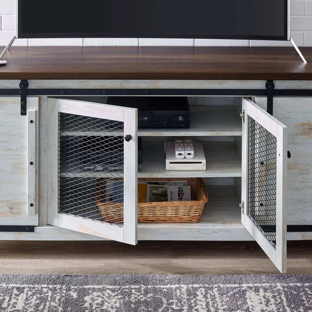Elevate your living room decor with the charming rustic barnyard look of the Bennington 71″ Sliding Door TV Stand. A charming addition to the lounge room, bedroom, or living space, this entertainment center features six spacious and height-adjustable shelves with cable management for organizing all your media essentials. At 71″ long, this entertainment console accommodates flat screen TVs up to 68″ wide. This farmhouse-inspired TV stand is made of durable particleboard with wood-grain veneer and comes with two sliding doors, and two hinged mesh front doors, for versatile hideaway storage. A stylish anchor, Bennington is also perfect for use as a sideboard, display stand, credenza, and storing and serving buffet table in the living room, entryway, or dining room.
