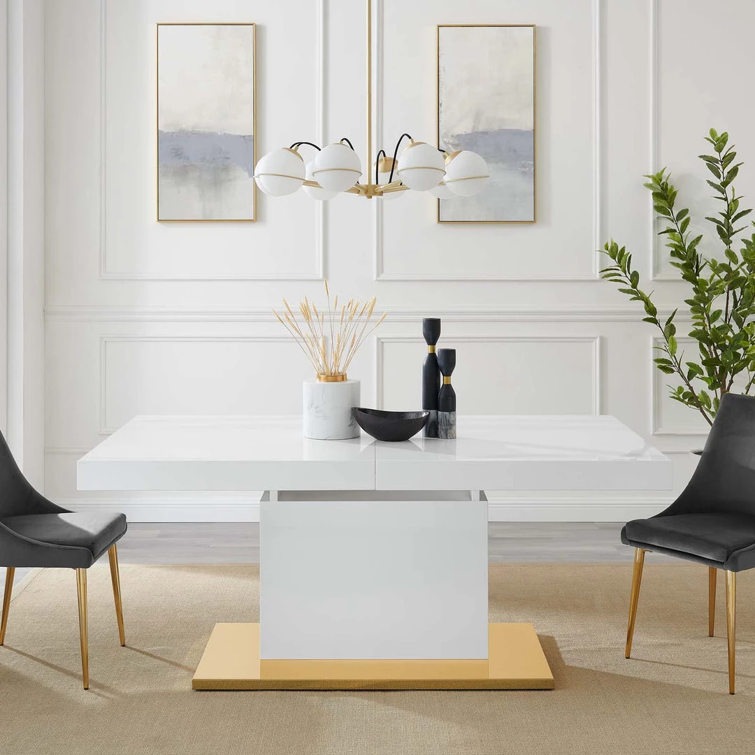 Reimagine your dining decor with the Vector Expandable Dining Table. Tailored for all occasions from intimate dining to festive gatherings, the organic wood grain surface on this dining table is perfect for haute cuisine and home cooking. Featuring durable fiberboard construction, wood veneer, a gold stainless steel base, a butterfly leaf with a lock that collapses inside the distinguished columnal base with ease, and non-marking foot pads to help protect your flooring, Vector comfortably seats up to eight people and extends from 71 to 94.5 inches.