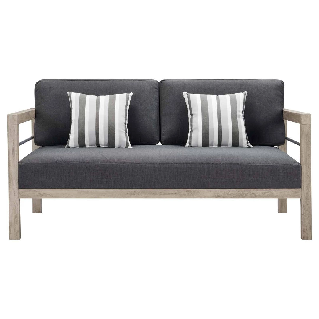 Invoke the refreshing feel of coastal accents with the Wiscasset Outdoor Patio Wood 59″ Loveseat. This FSC certified acacia wood two-seater loveseat has a slatted base with a reinforced center beam and matte aluminum supports for a strong seating experience. Densely padded all-weather cushions come with durable machine washable covers. Complete with two coordinating accent throw pillows, this modern outdoor loveseat will effortlessly enhance the decor of your patio, deck, porch, or poolside. Loveseat Weight Capacity: 661 lbs.